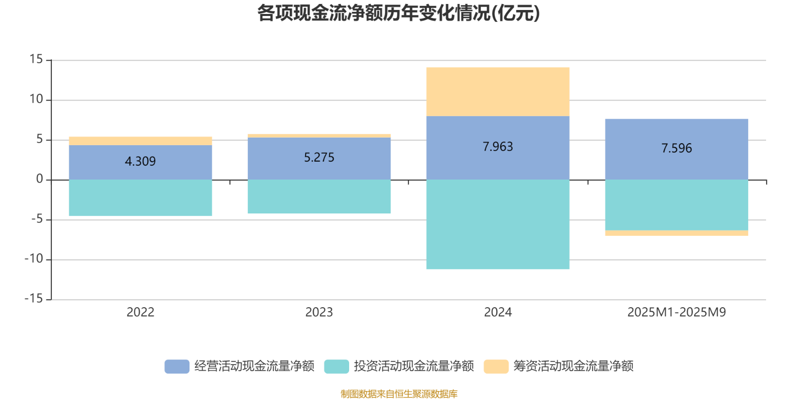 2025年1月至9月,公司经营活动现金流净额为7.6亿元,同比增长22.56%;筹资活动现金流净额-6663.2万元,同比减少5.61亿元;投资活动现金流净额-6.38亿元,上年同期为-6.85亿元。