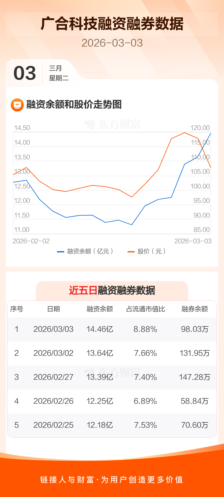 交易所最新数据显示,广合科技于2026年3月3日获融资买入1.58亿元,融资偿还7637.60万元,当日融资净买入8207.41万元。目前,该股融资余额14.46亿,占流通市值比例为8.88%。