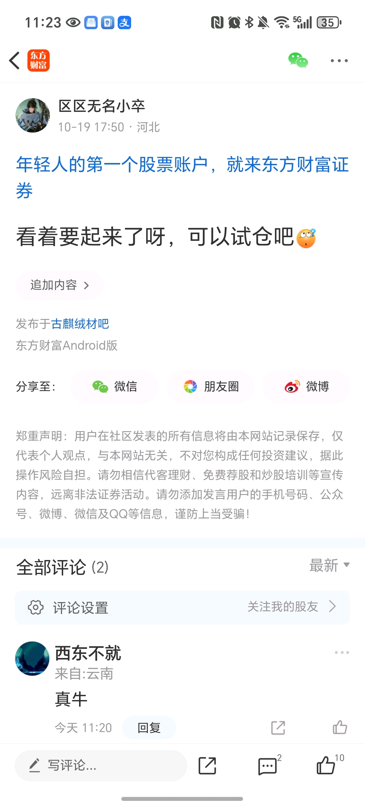 温馨提示: 1.根据《证券法》规定,禁止编造、传播虚假信息或者误导性信息,扰乱证券市场;2.用户在本社区发表的所有资料、言论等仅代表个人观点,与本网站立场无关,不对您构成任何投资建议。用户应基于自己的独立判断,自行决定证券投资并承担相应风险。《东方财富社区管理规定》