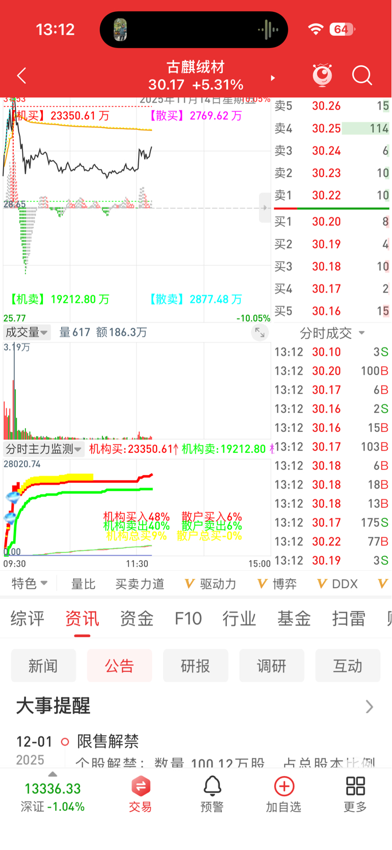 $古麒绒材(SZ001390)$ 机构买入比例高