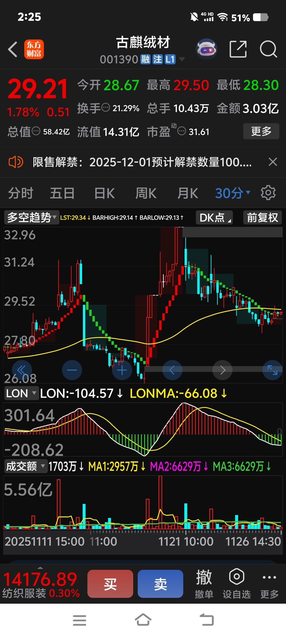 $古麒绒材(SZ001390)$ 目前 东方证券看日线调整状态,29.15转战该股,明天赚钱就抛,目前行情必须采用麻雀战术