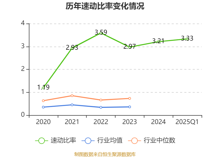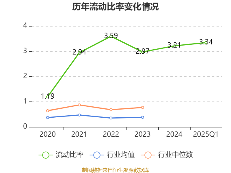 2025年第一季度,公司流动比率为3.34,速动比率为3.33。