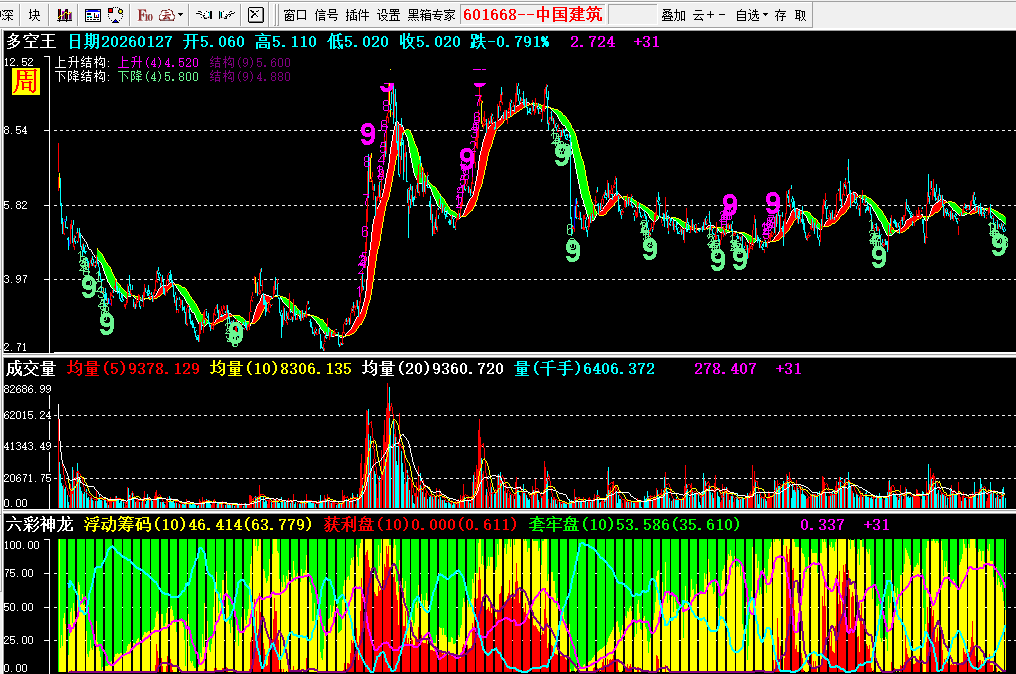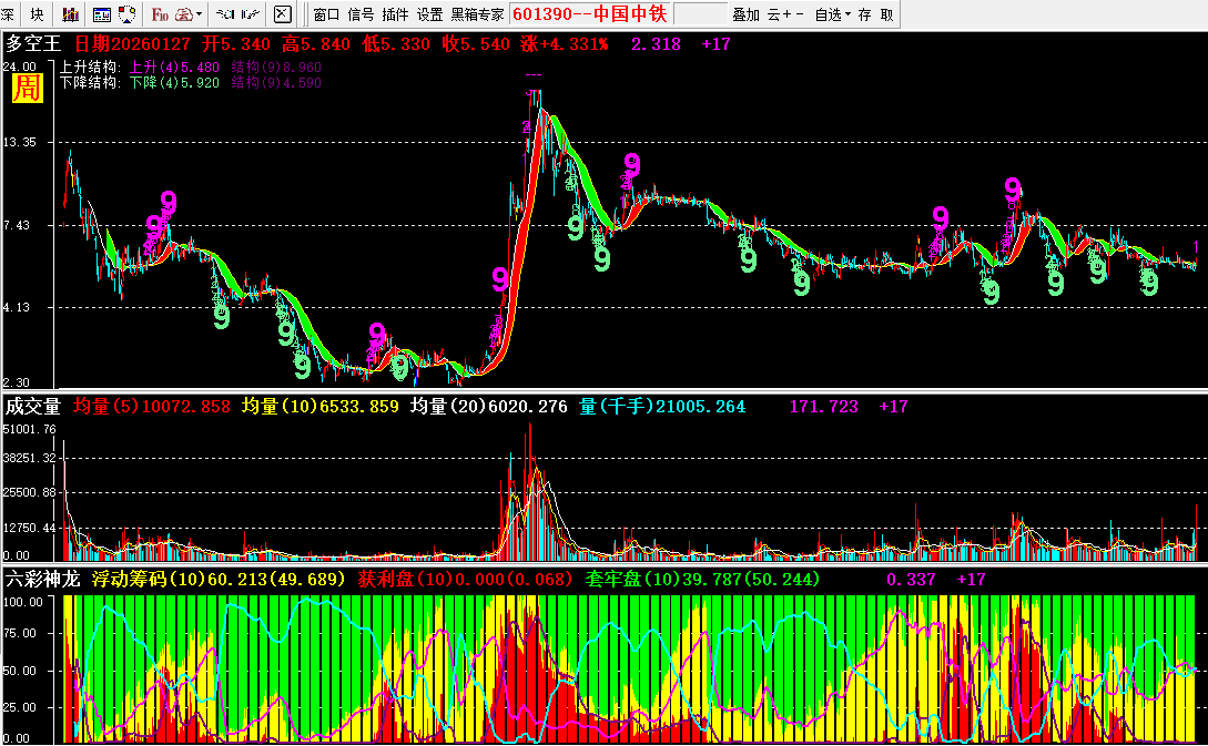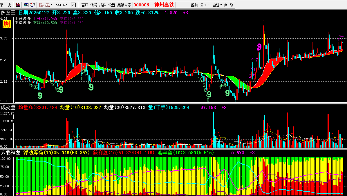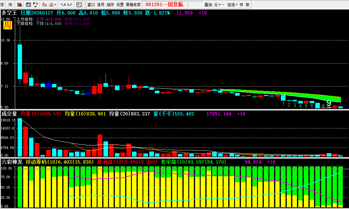 今天整理些历年走势中就一般般的股票,包括国货航。截了图。截图的是周线,股票的代码和名称在图上的中间最上面。股票下跌波段,是绿数字1到9 ,股票上涨波段,是红数字1到9.