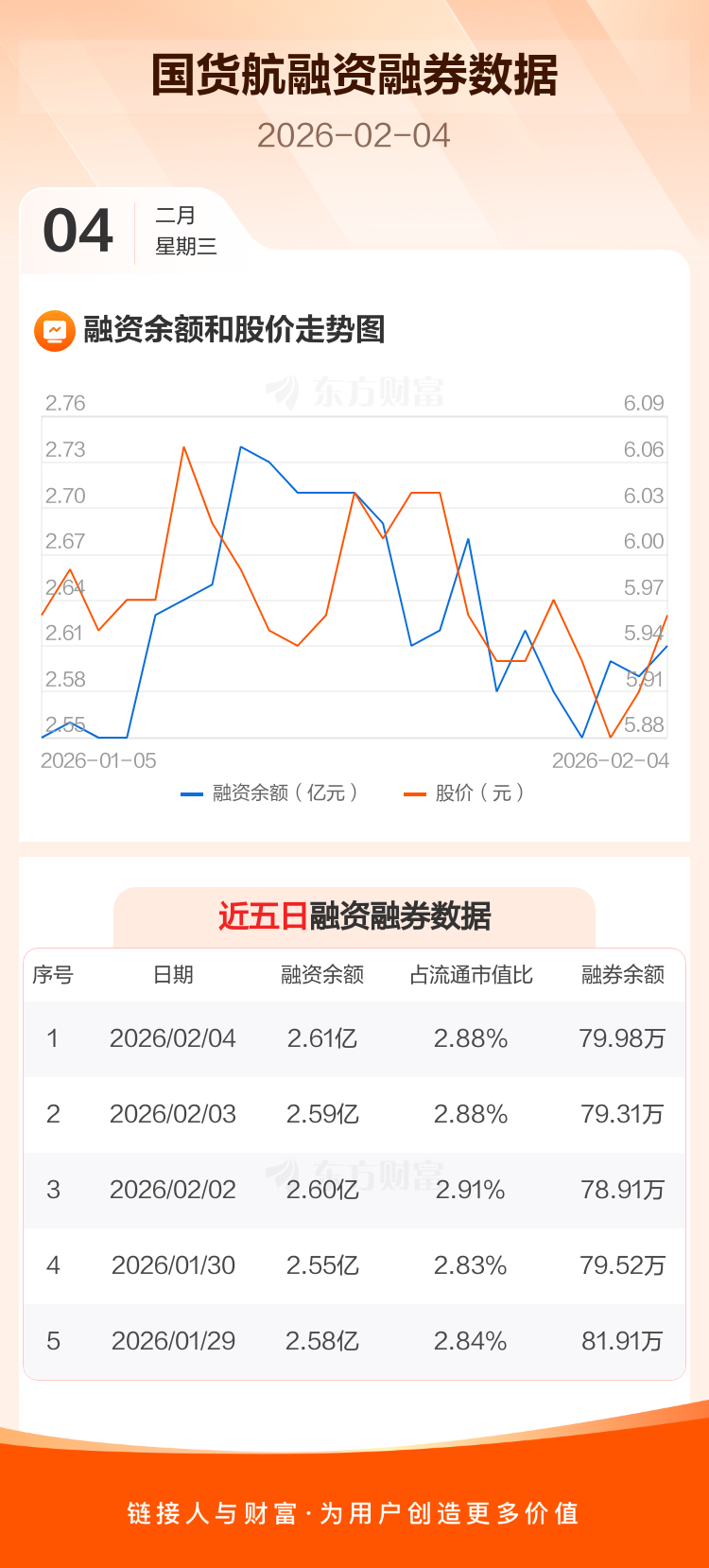 交易所最新数据显示,国货航于2026年2月4日获融资买入1352.00万元,融资偿还1145.10万元,当日融资净买入206.89万元。目前,该股融资余额2.61亿,占流通市值比例为2.88%。