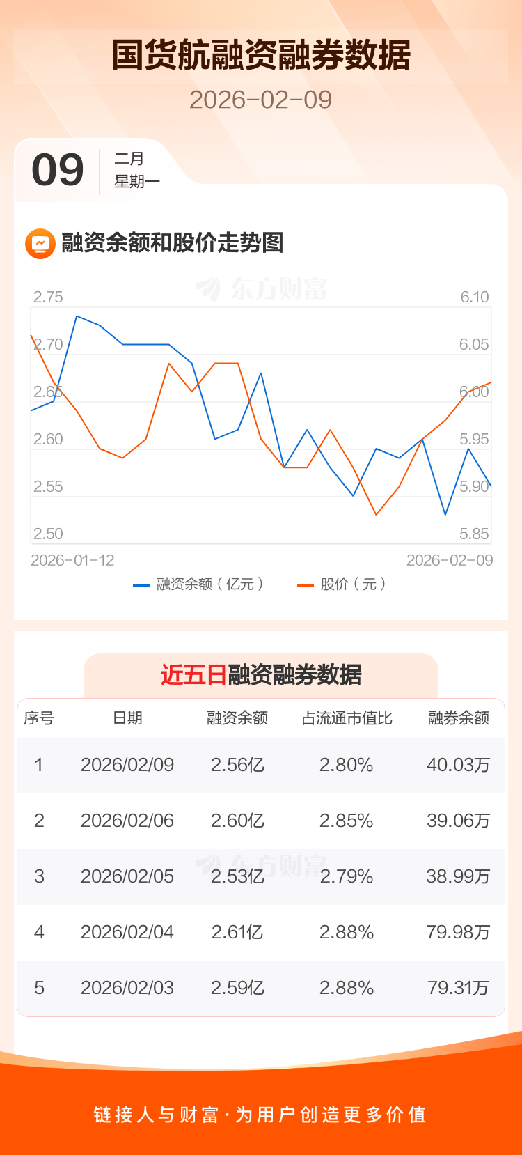 交易所最新数据显示,国货航于2026年2月9日获融资买入1087.62万元,融资偿还1484.40万元,当日融资净偿还396.78万元。目前,该股融资余额2.56亿,占流通市值比例为2.80%。