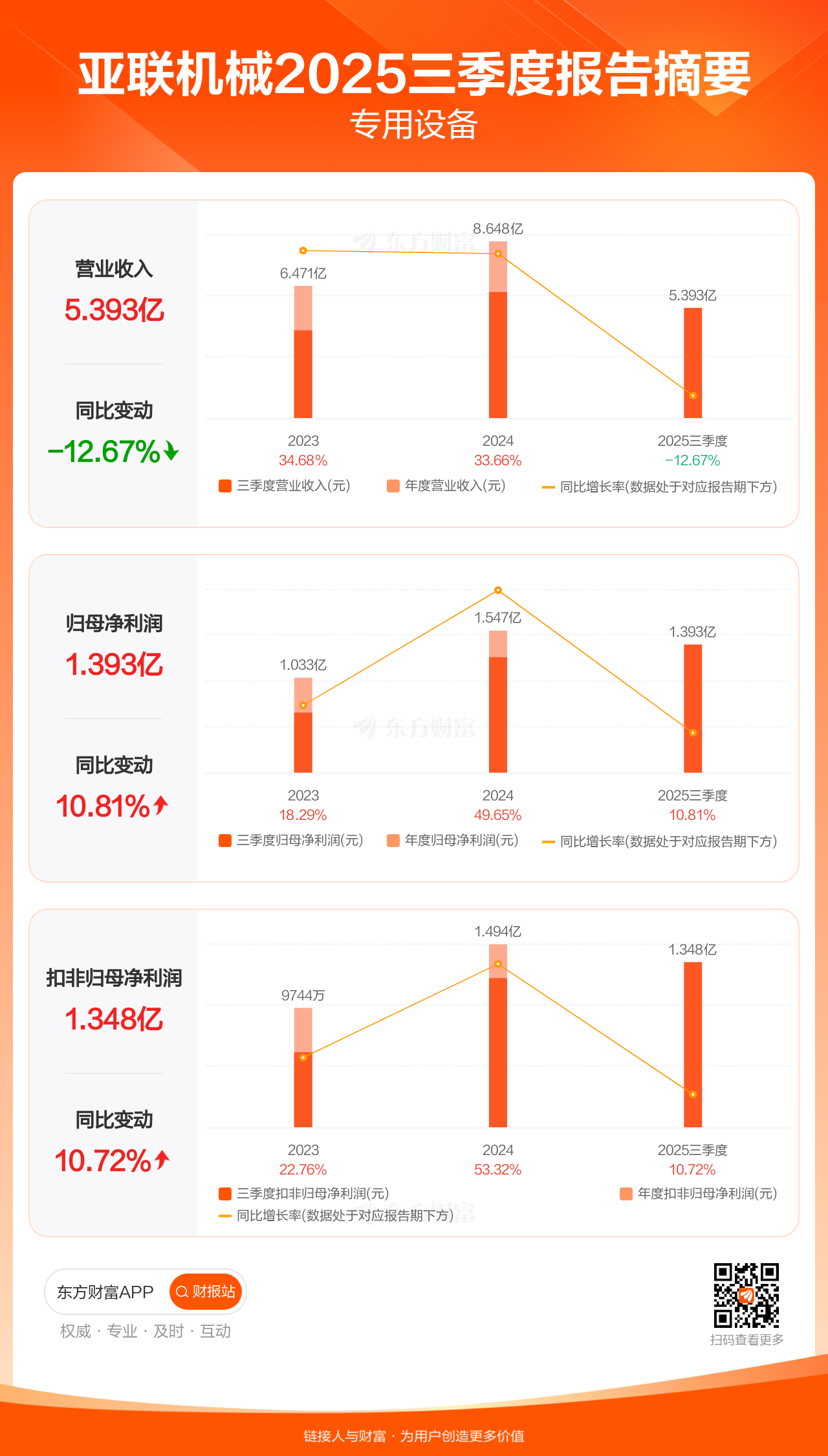 亚联机械10月27日发布2025年三季报显示,公司前三季实现营业收入5.39亿元,同比下滑12.67%;归母净利润1.39亿元,同比增长10.81%;扣非归母净利润1.35亿元,同比增长10.72%。