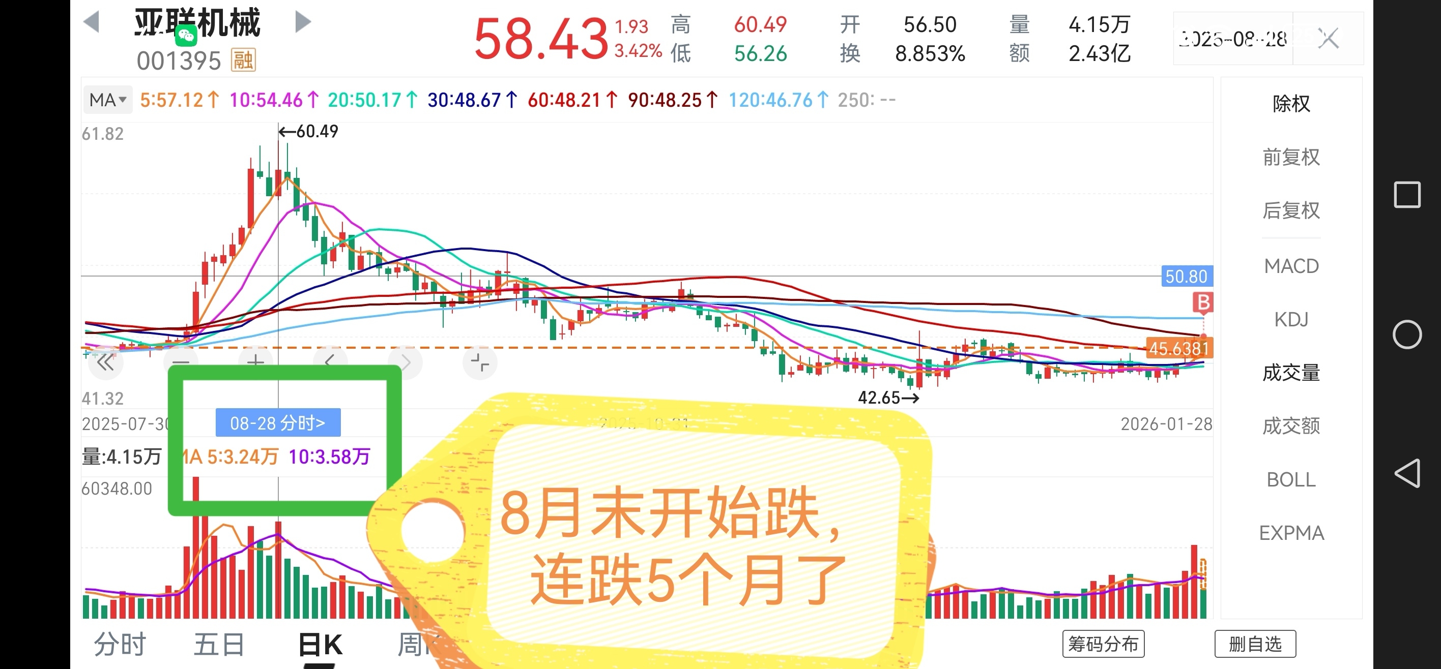 隐患:昨天限售股解禁,大盘在高位(但大盘连涨5个月,这票连跌5个月,还会跟着大盘一起跌?),行业也一般!