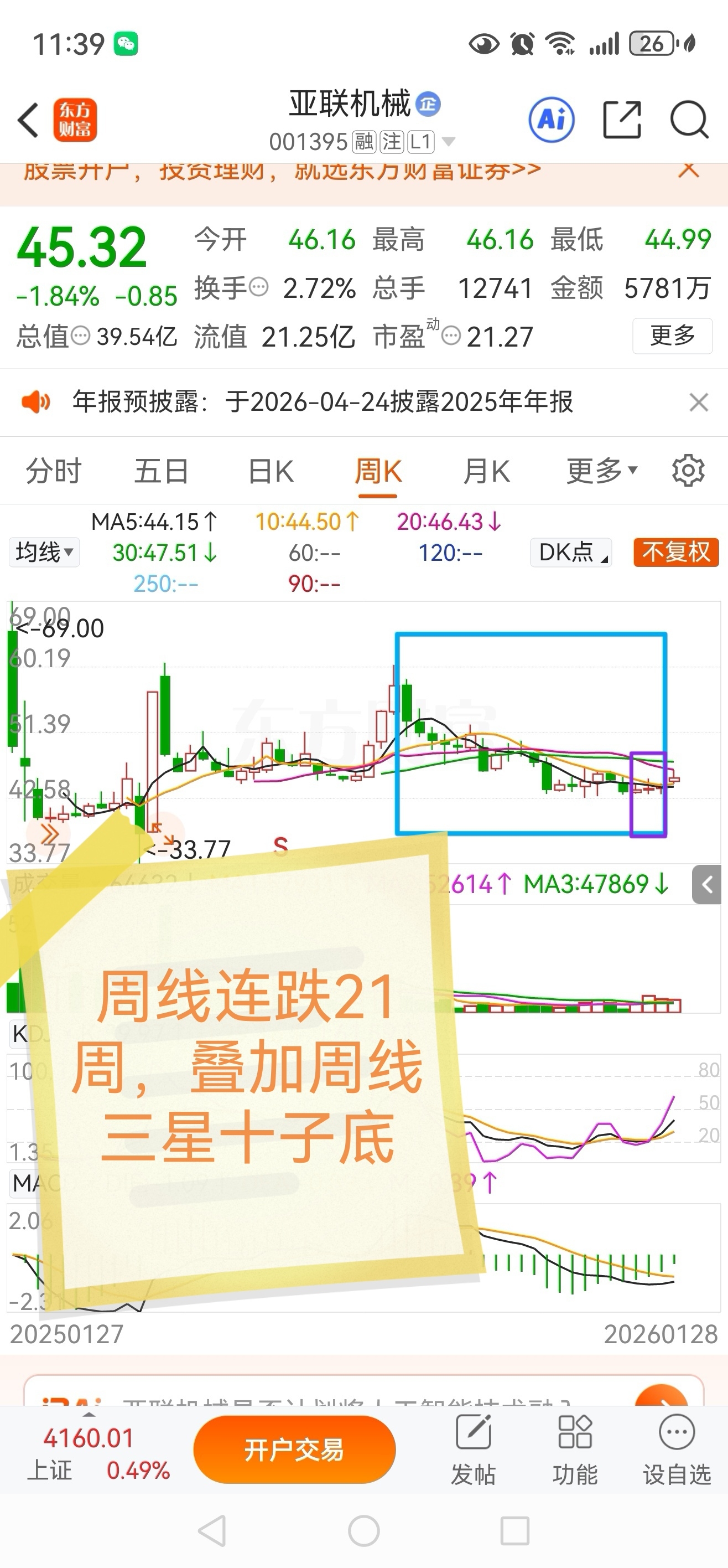 周线连跌21周,叠加周线三星十字底
