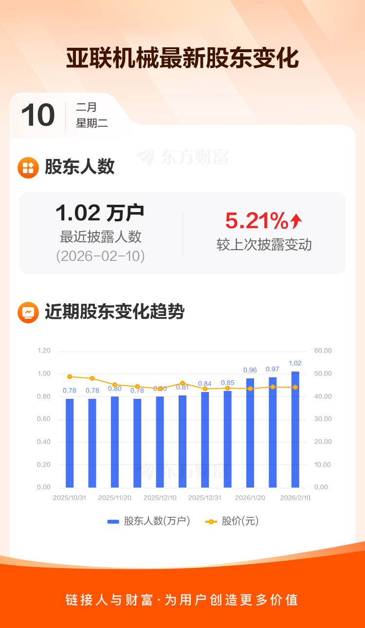 亚联机械最新披露数据显示,截至2月10日公司股东户数为1.02万户,较上期(2026年1月30日)增加507户,增幅为5.21%。户均持有流通股数量由上期的4816股下降至4577股,户均持股金额由上期的21.32万元减少至20.19万元。