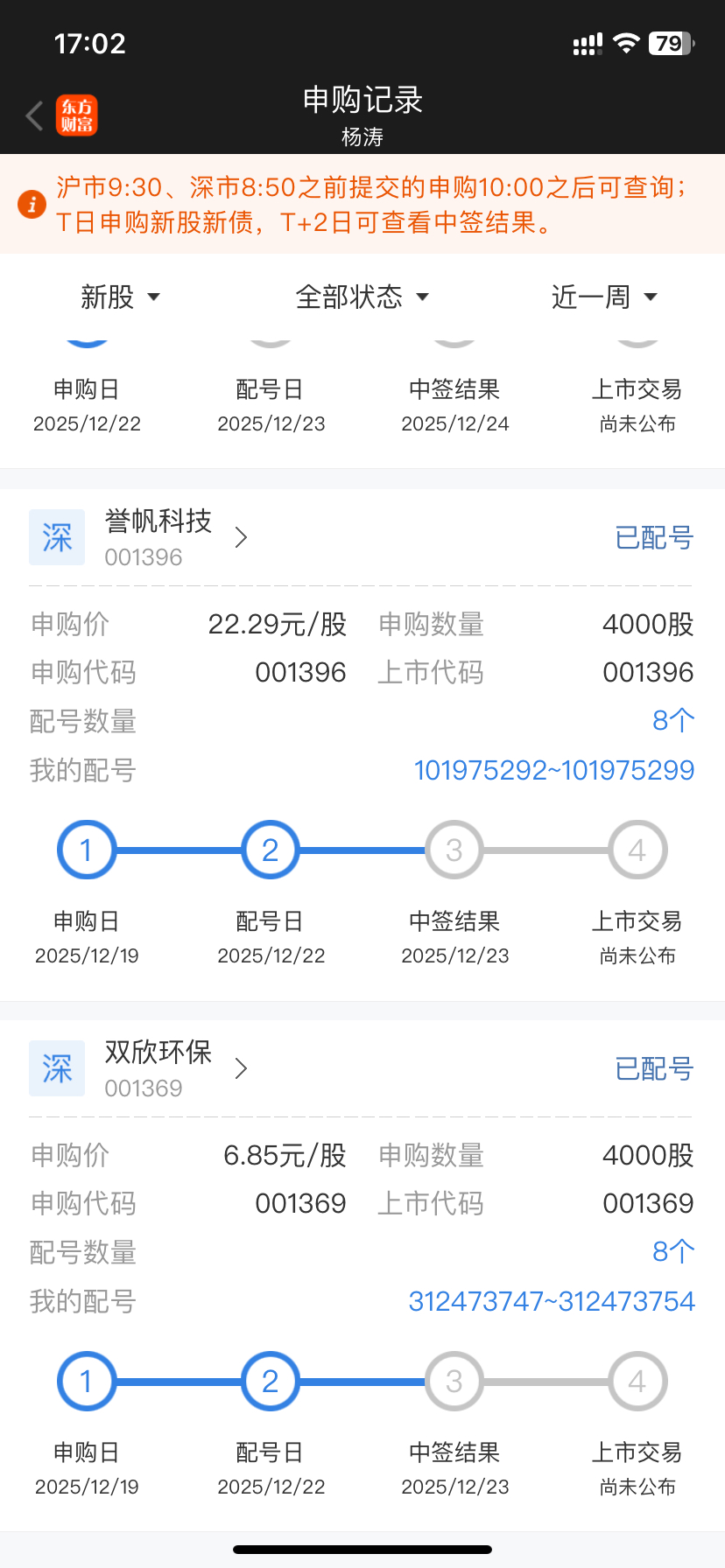 $誉帆科技(SZ001396)$ $双欣环保(SZ001369)$ 帮我看一下中了吗
