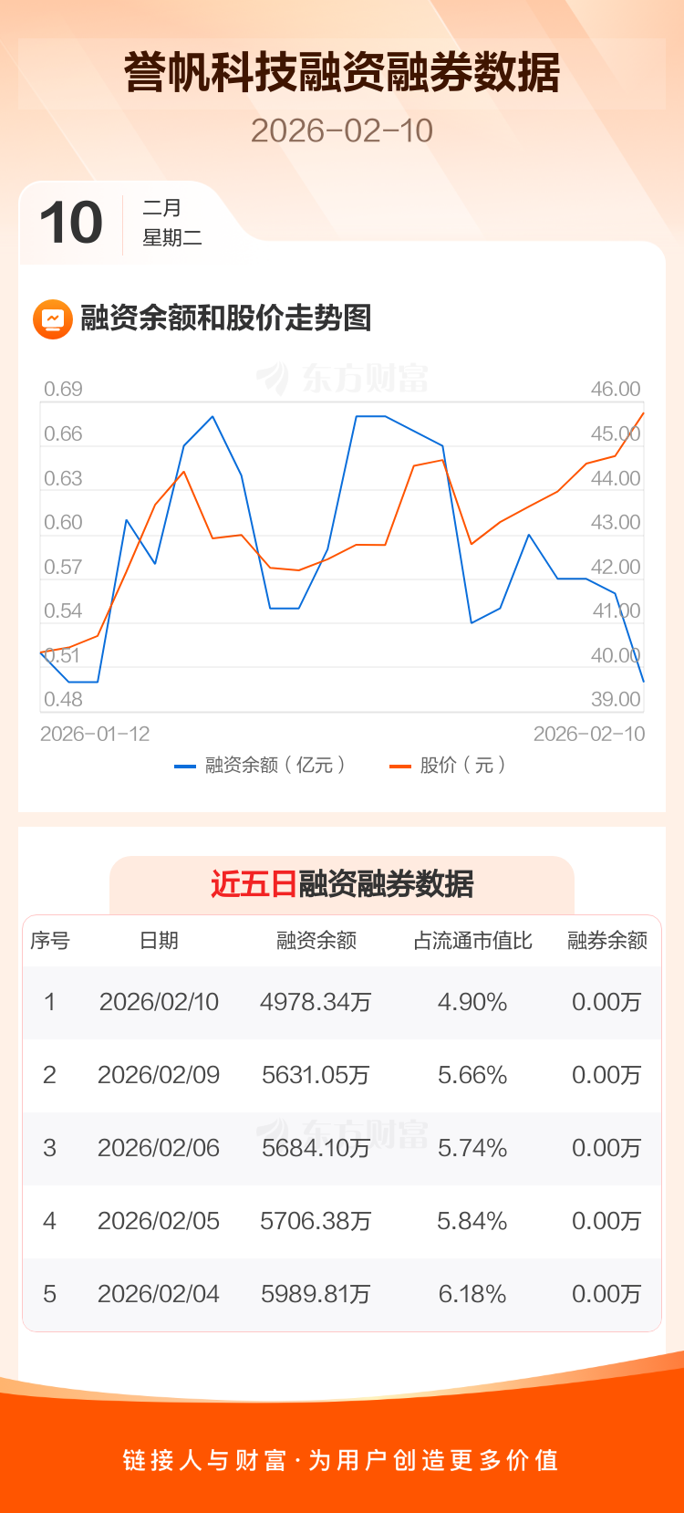 交易所最新数据显示,誉帆科技于2026年2月10日获融资买入729.11万元,融资偿还1381.81万元,当日融资净偿还652.7万元。目前,该股融资余额4978.34万,占流通市值比例为4.90%。