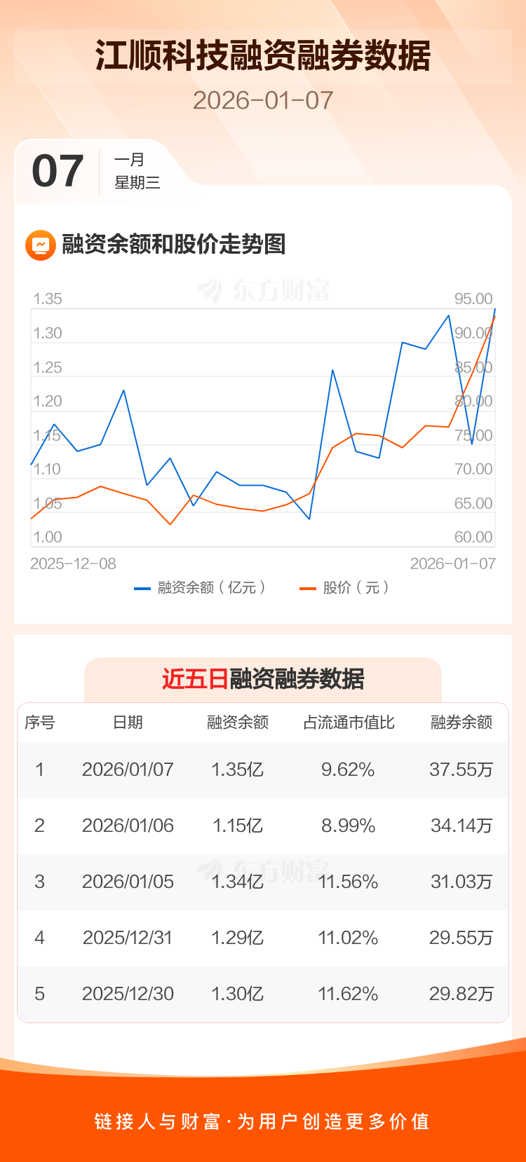 交易所最新数据显示,江顺科技于2026年1月7日获融资买入6634.00万元,融资偿还4605.91万元,当日融资净买入2028.1万元。目前,该股融资余额1.35亿,占流通市值比例为9.62%。