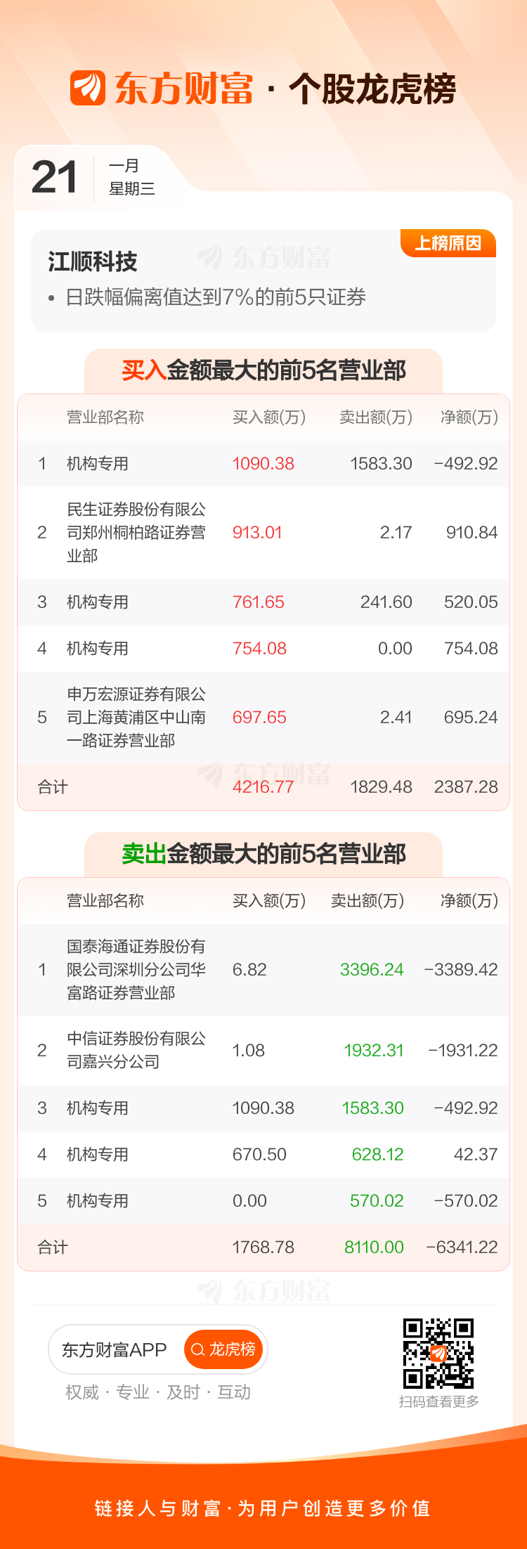 交易所2026年1月21日公布的交易公开信息显示,江顺科技因成为日跌幅偏离值达到7%的前5只证券上榜。江顺科技当日收报108.5元,涨跌幅-10.00%,偏离值-10.64%,换手率18.47%,成交额3.12亿。