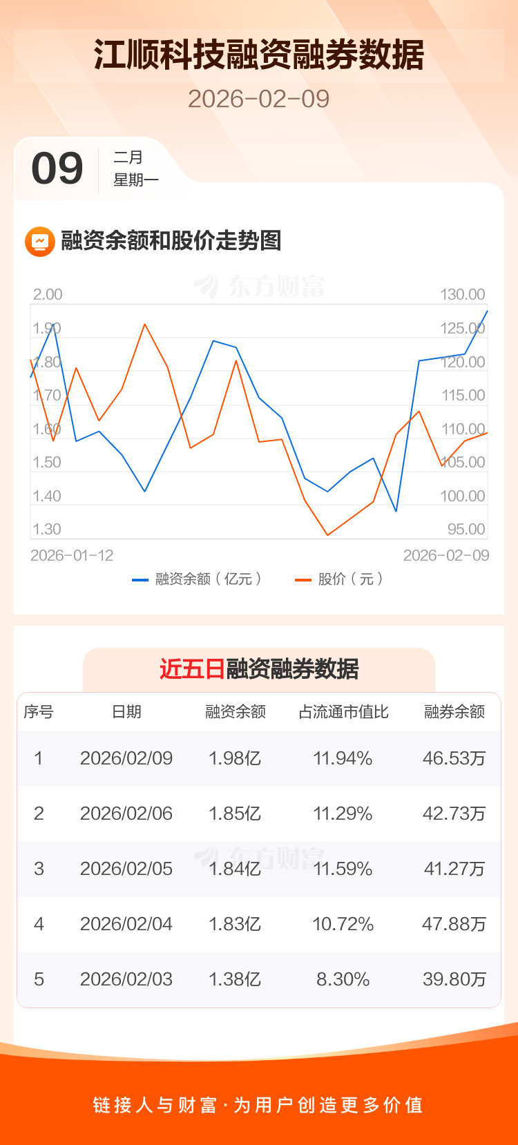 交易所最新数据显示,江顺科技于2026年2月9日获融资买入3891.77万元,融资偿还2596.12万元,当日融资净买入1295.64万元。目前,该股融资余额1.98亿,占流通市值比例为11.94%。
