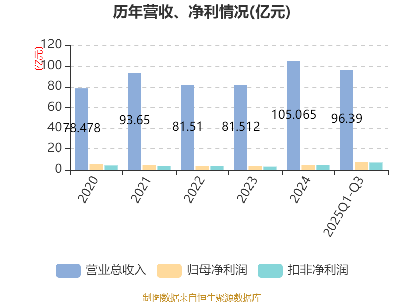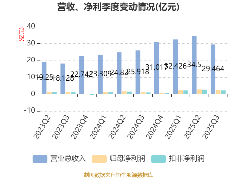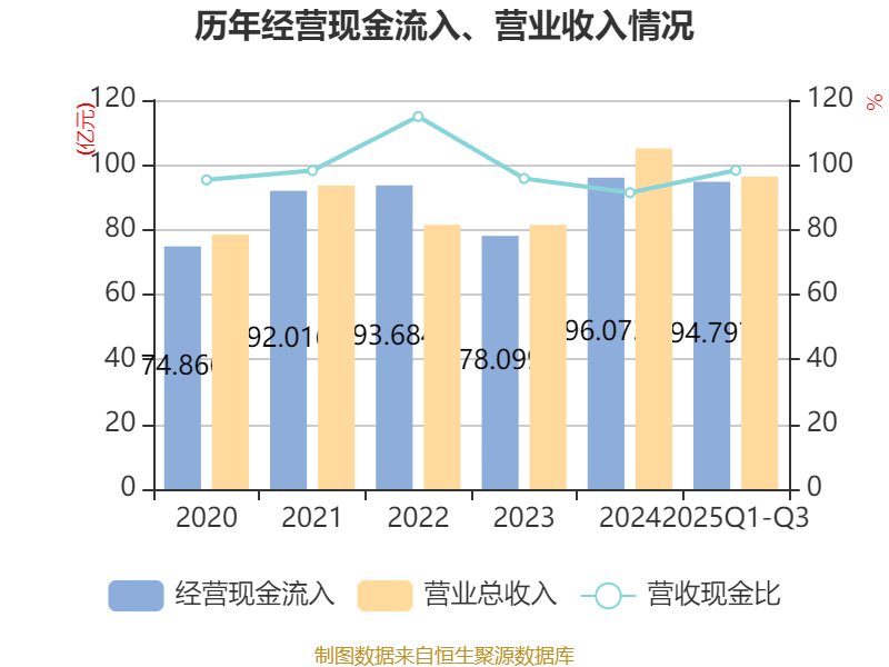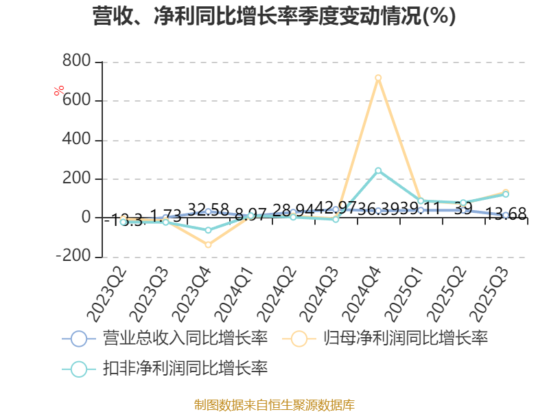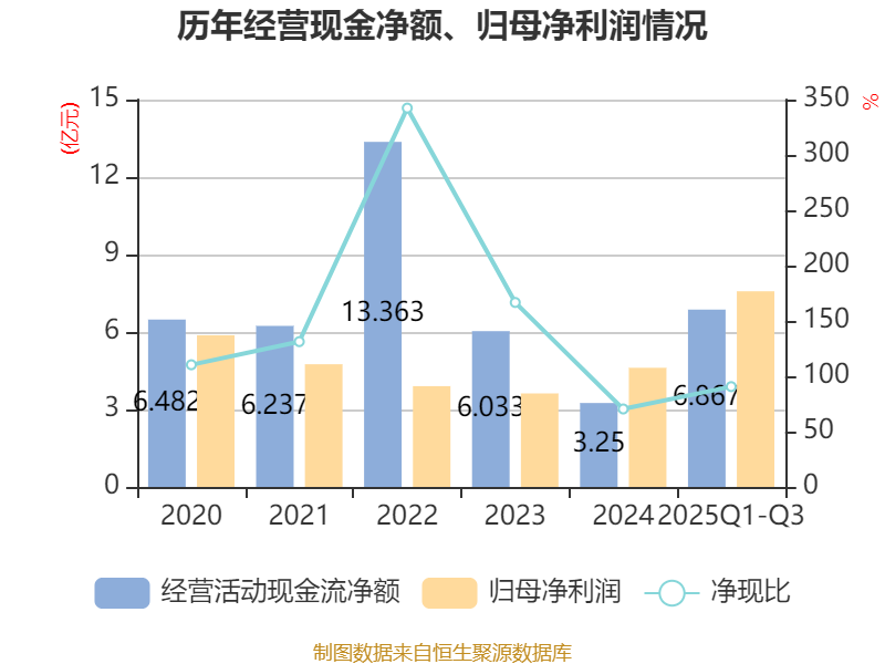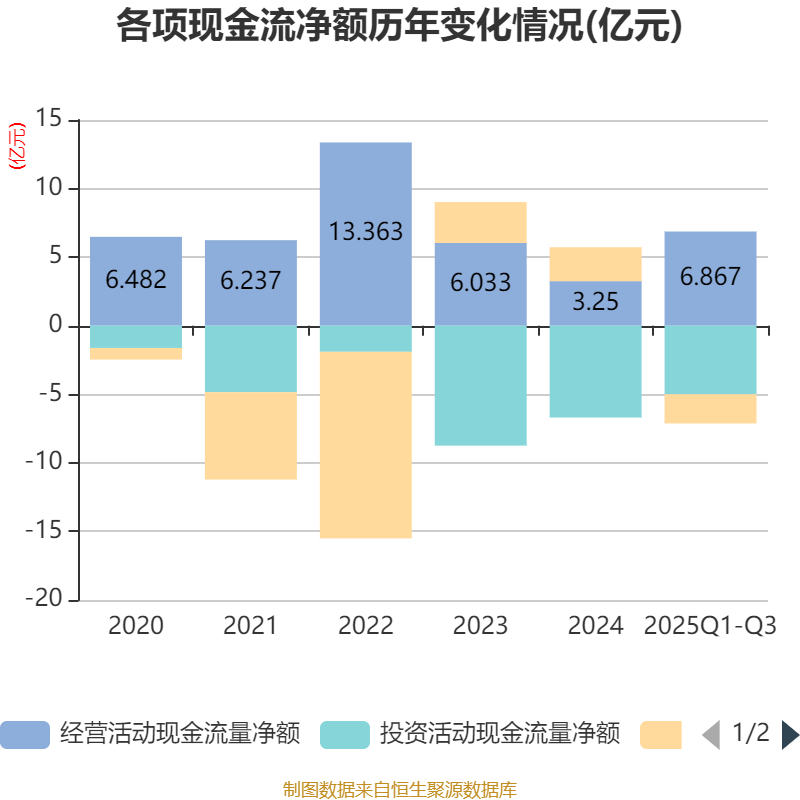 2025年前三季度,公司经营活动现金流净额为6.87亿元,同比增长86.87%;筹资活动现金流净额-2.13亿元,同比减少6.28亿元;投资活动现金流净额-5亿元,上年同期为-5.83亿元。