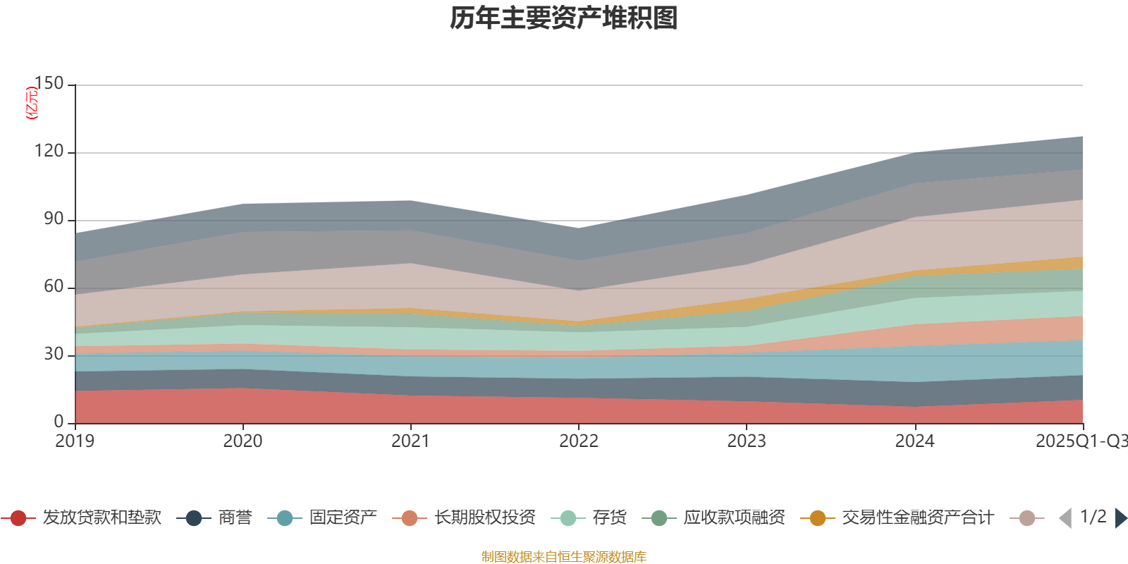 资产重大变化方面,截至2025年三季度末,公司交易性金融资产合计较上年末增加116.12%,占公司总资产比重上升2.09个百分点;发放贷款和垫款较上年末增加42.65%,占公司总资产比重上升2.07个百分点;货币资金较上年末减少10.58%,占公司总资产比重下降1.95个百分点;固定资产较上年末减少3.17%,占公司总资产比重下降1.16个百分点。