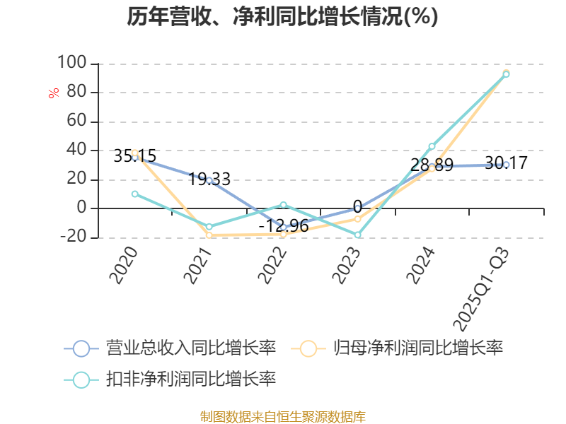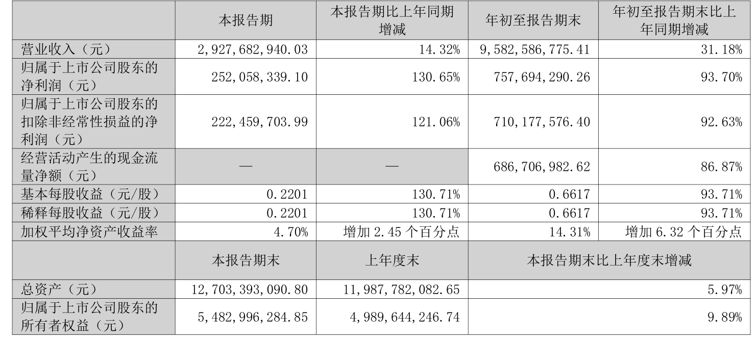 中证智能财讯宗申动力(001696)10月31日披露2025年第三季度报告。前三季度公司实现营业总收入96.39亿元,同比增长30.17%;归母净利润7.58亿元,同比增长93.70%;扣非净利润7.1亿元,同比增长92.63%;经营活动产生的现金流量净额为6.87亿元,同比增长86.87%;报告期内,宗申动力基本每股收益为0.6617元,加权平均净资产收益率为14.31%。