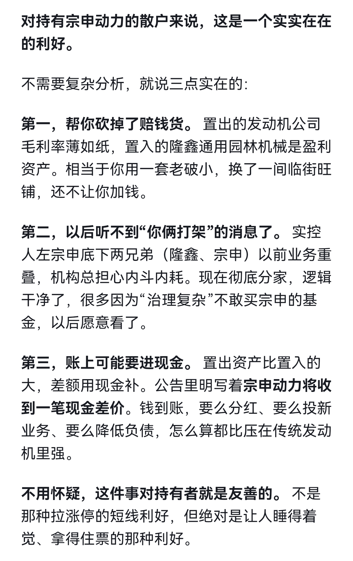 $宗申动力(SZ001696)$ 资产置换,对宗申动力是实实在在的利好