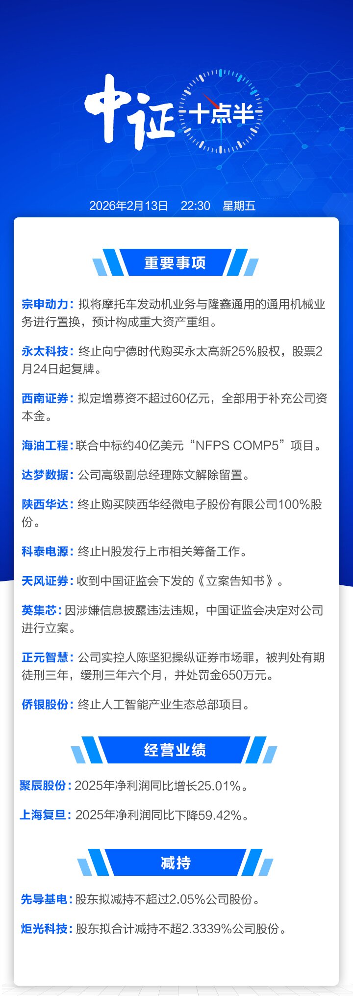 【中证十点半】宗申动力拟重大资产重组;天风证券被证监会立案;科泰电源终止H股发行上市相关筹备工作