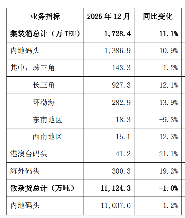 招商港口发布的业务信息,2024年12月海外码头集装箱为304.6,2025年12月海外码头集装箱为300.3.但2025年12月海外码头的月同比增幅却为19.2%,不知道是什么计算出来的???求证,,,,,。数据截图来源招商港口公开每月发布的业务数据披露