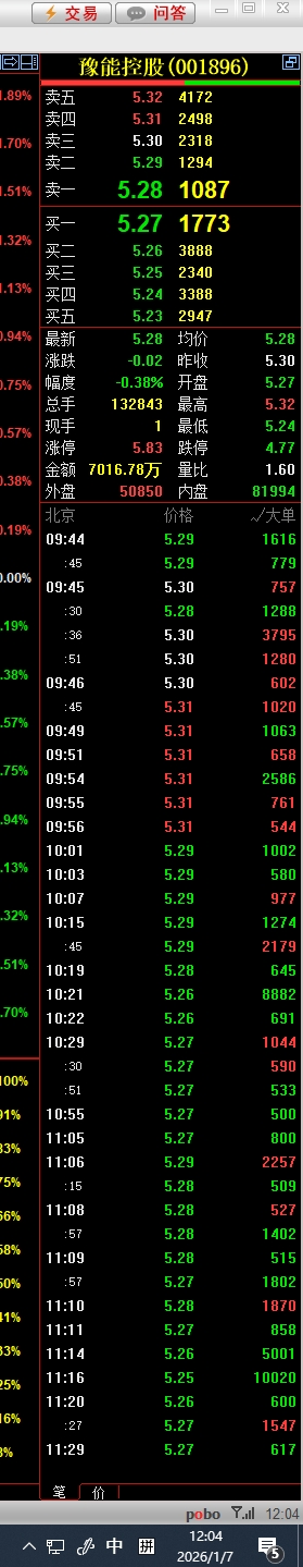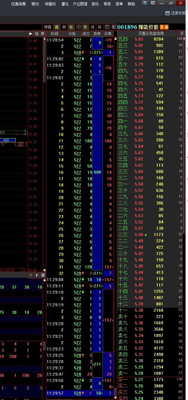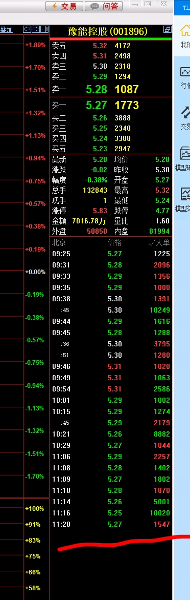 $豫能控股(SZ001896)$ 目前看,流出资金844.8万,一个手大单砸盘4.6万多手!砸了二分钱!承接力还是乐观的!没有恐慌性抛盘!一千手大单成交量占比52%!明显暴露!500手以上占比62%以上成交!可见里面实力!
