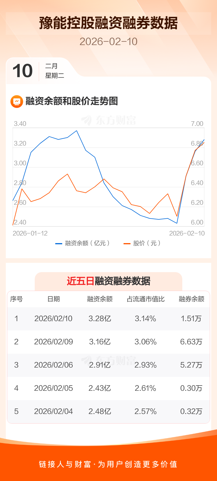 交易所最新数据显示,豫能控股于2026年2月10日获融资买入4608.78万元,融资偿还3419.57万元,当日融资净买入1189.21万元。目前,该股融资余额3.28亿,占流通市值比例为3.14%。
