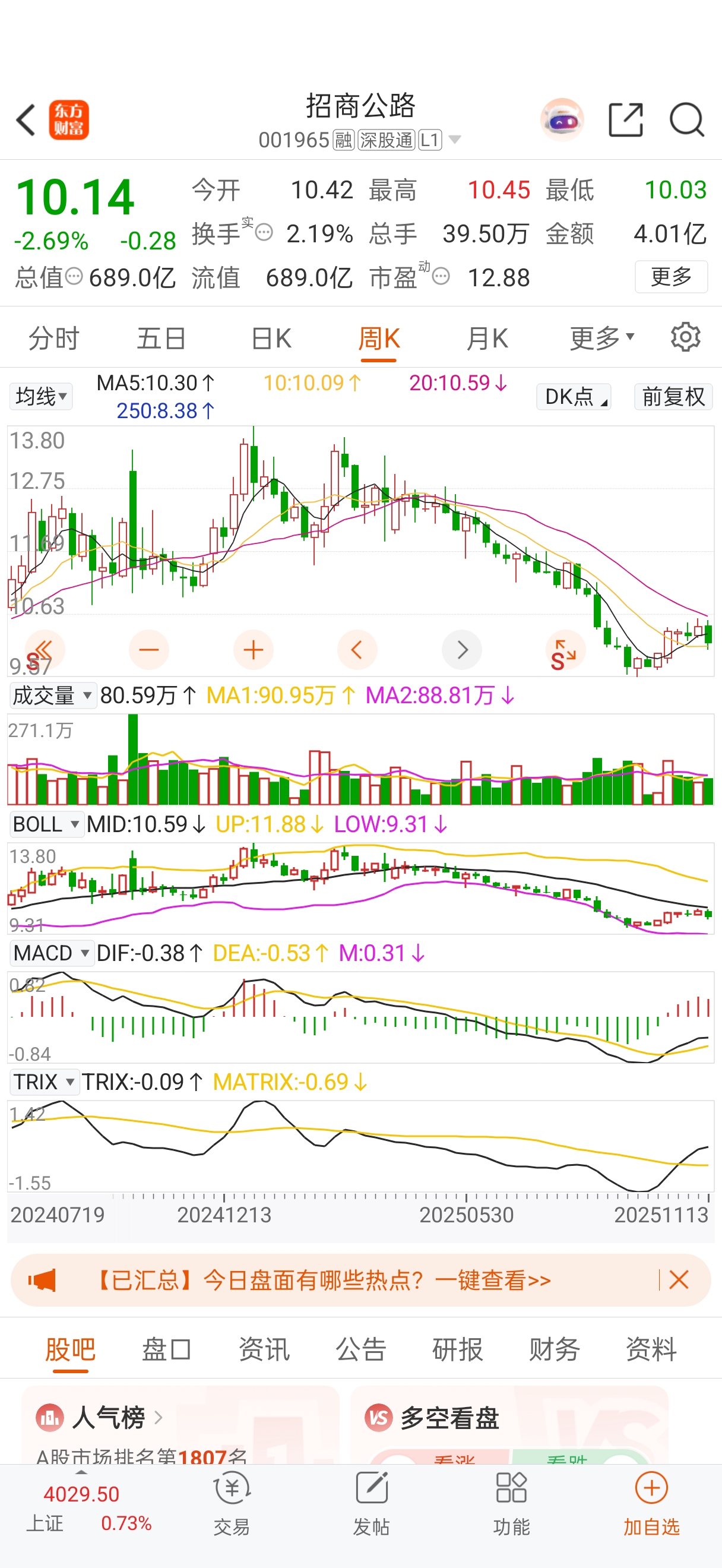 $招商公路(SZ001965)$ 周线不肯金叉,热度一下子上来了,大批散户开始关注。