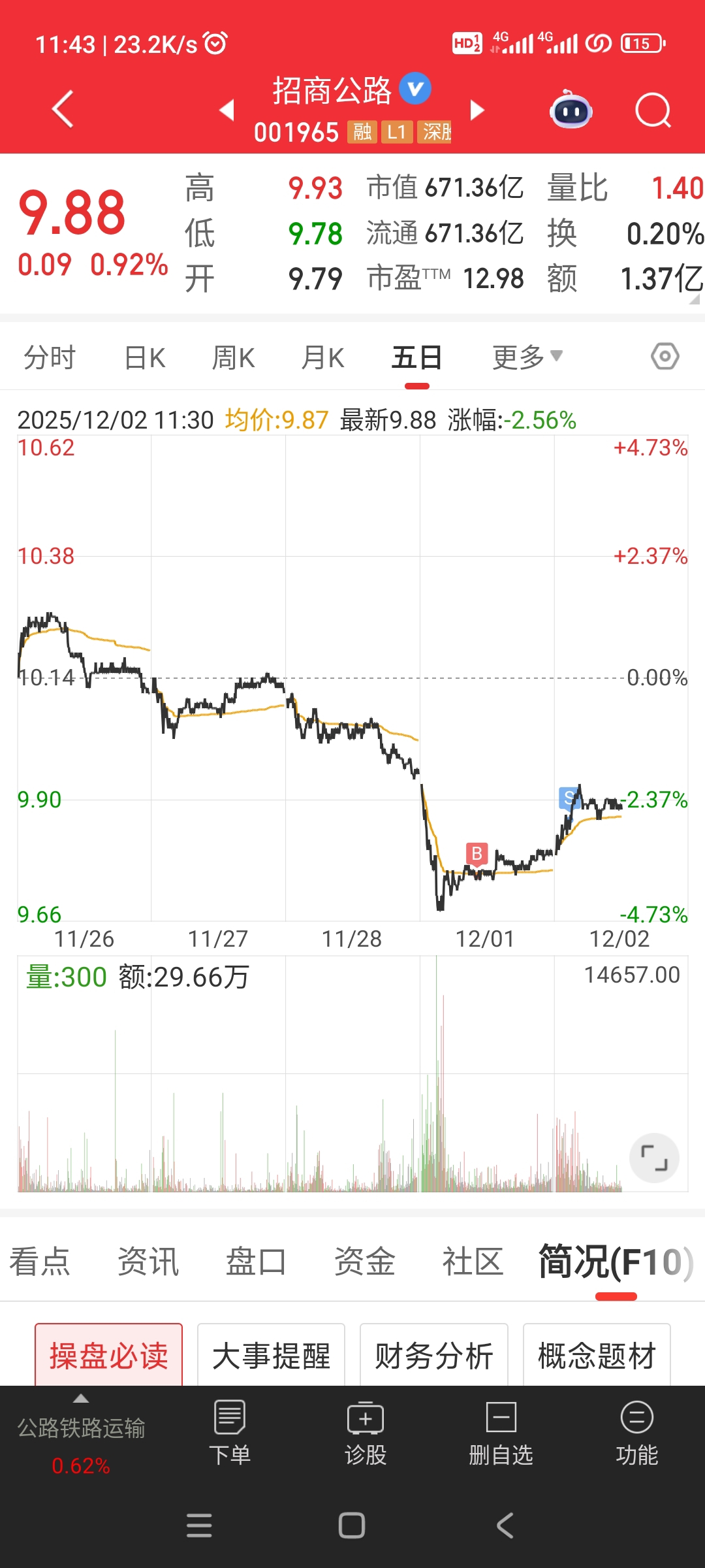 $招商公路(SZ001965)$ 昨天买的今天先跑了,这个位置如果诱多的话再往下跌那得套很长时间。等大跌在进来拿长线。
