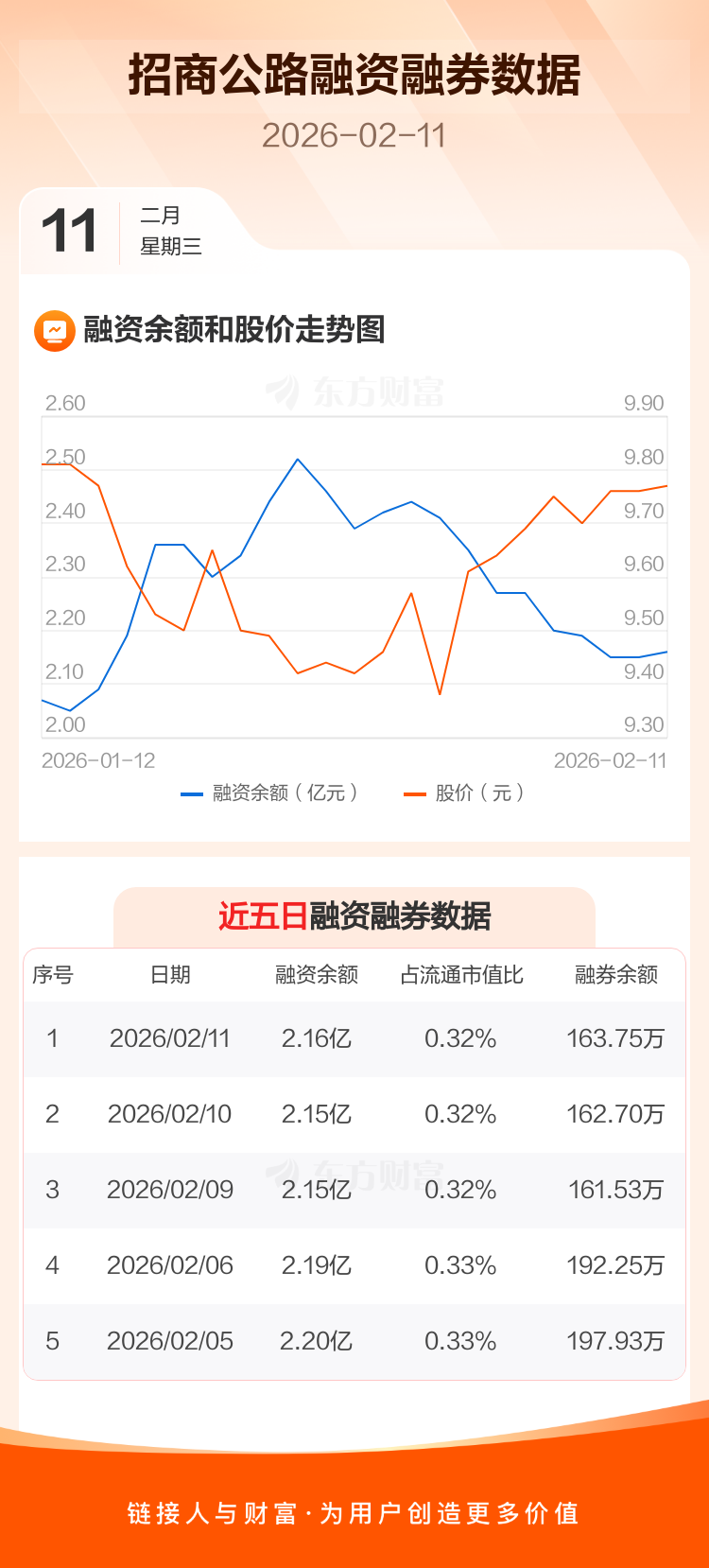 交易所最新数据显示,招商公路于2026年2月11日获融资买入533.04万元,融资偿还464.27万元,当日融资净买入68.77万元。目前,该股融资余额2.16亿,占流通市值比例为0.32%。