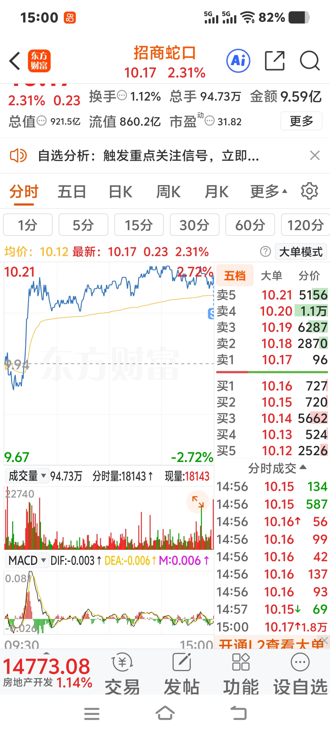 $招商蛇口(SZ001979)$ 哈哈,收盘价卖出,卖飞了吗