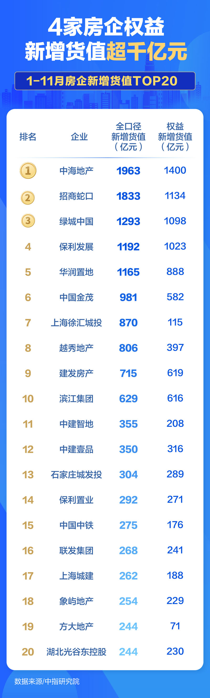 权益拿地金额方面,1-11月,中海地产、绿城中国、招商蛇口分别以870亿元、588亿元、564亿元位居前三名。