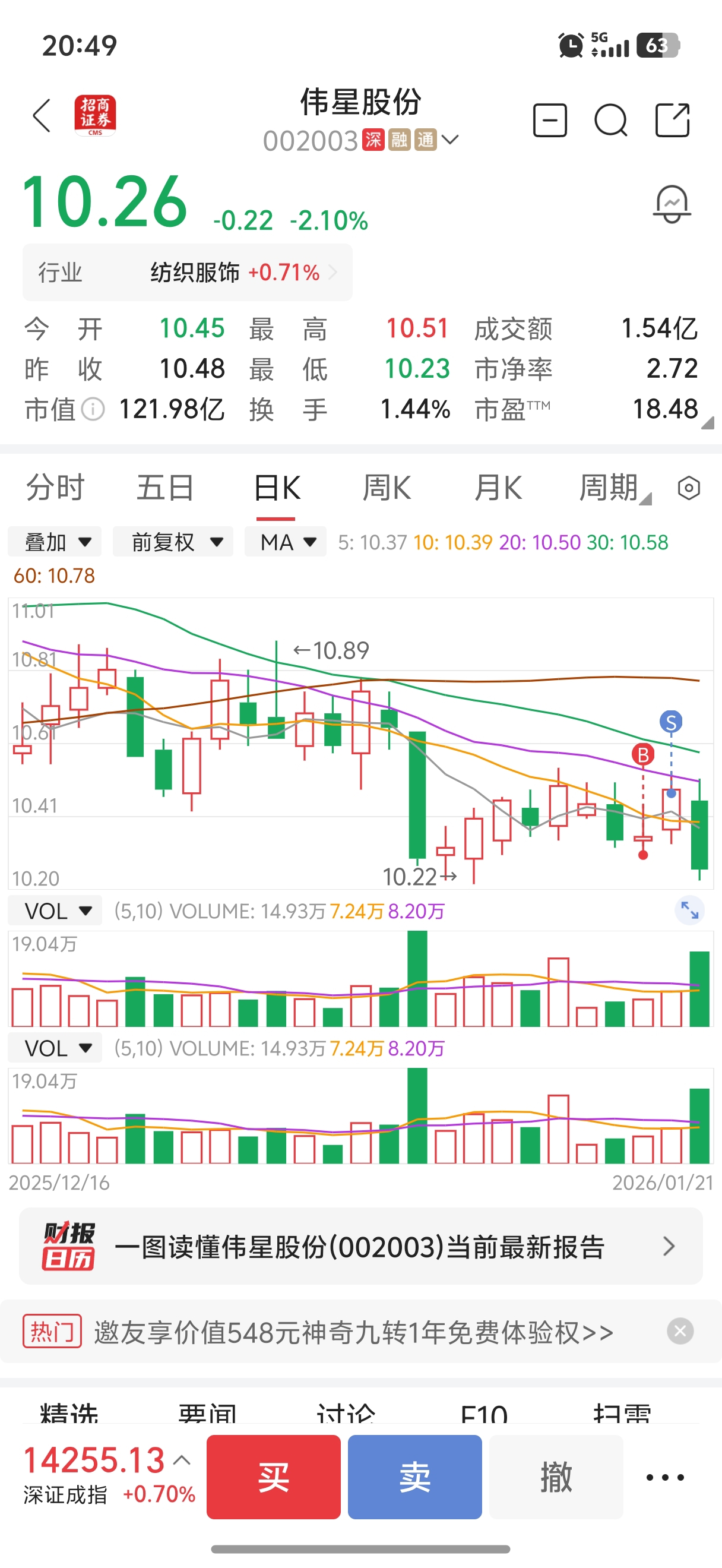 $伟星股份(SZ002003)$ 周一10.3买,周二10.47卖,周四这个票还能进吗?