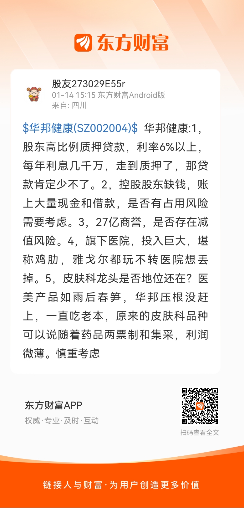 $华邦健康(SZ002004)$ 华邦健康:1,股东高比例质押贷款,利率6%以上,每年利息几千万,走到质押了,那贷款肯定少不了。2,控股股东缺钱,账上大量现金和借款,是否有占用风险需要考虑。3,27亿商誉,是否存在减值风险。4,旗下医院,投入巨大,堪称鸡肋,雅戈尔都玩不转医院想丢掉。5,皮肤科龙头是否地位还在?医美产品如雨后春笋,华邦压根没赶上,一直吃老本,原来的皮肤科品种可以说随着药品两票制和集采,利润微薄。慎重考虑
