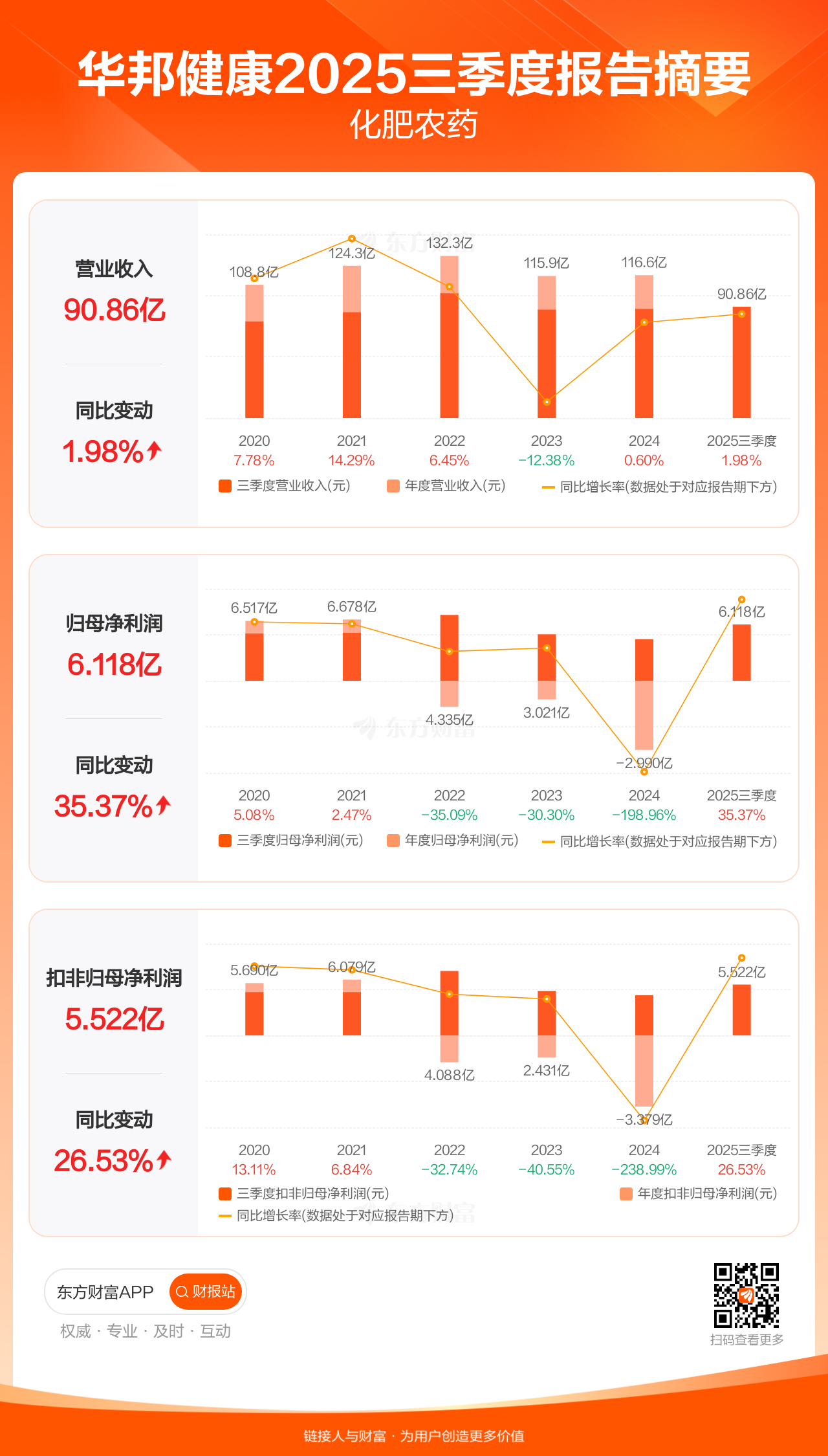 华邦健康10月29日发布2025年三季报显示,公司前三季实现营业收入90.86亿元,同比增长1.98%;归母净利润6.12亿元,同比增长35.37%;扣非归母净利润5.52亿元,同比增长26.53%