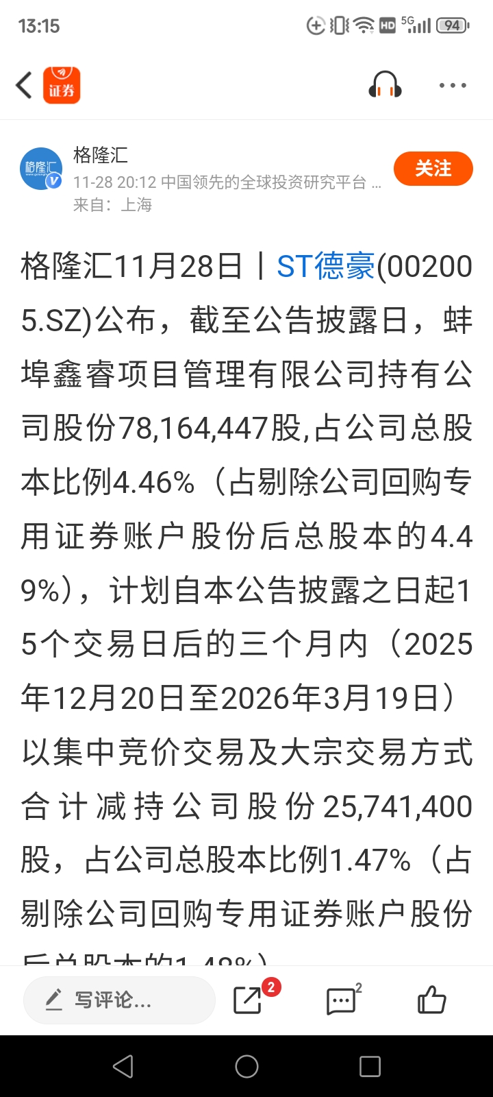 $ST德豪(SZ002005)$ $ 2500万股第一波减持开始,第二波5000万股第二波将今年底公告!第三波100000000股明年3月开始!唉!重回2元令人恐怖!