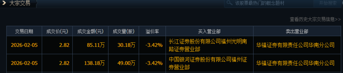 今天又有大宗了,两笔,共计79.18万股,成交价2.82,溢价率-3.42%。至