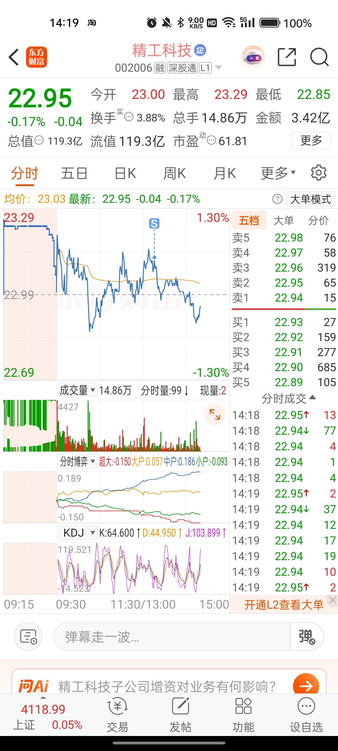$精工科技(SZ002006)$ 上午亏了两百出去了,换了汉缆。