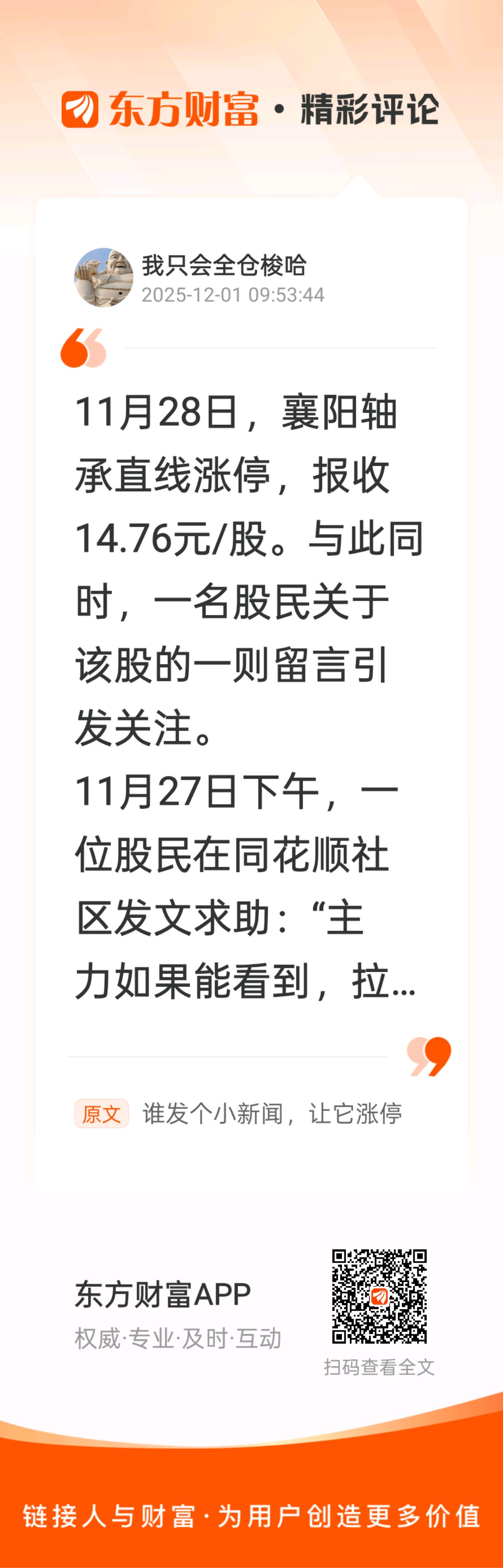 //@我只会全仓梭哈 :11月28日,襄阳轴承直线涨停,报收14.76元/股。与此同时,一名股民关于该股的一则留言引发关注。11月27日下午,一位股民在同花顺社区发文求助:“主力如果能看到,拉个涨停吧,孩子重病钱不够努力凑了,只能在这搏一下,能行我努力了不行只能认命!!如果搏对了我永远记着主力恩情,等有能力想办法回报您!!!实在没办法了,谢谢大家帮忙,希望主力看到能帮我一次,求求您了,我不会轻易认输,我是真没招了来这碰下运气,实在不行我真的无力了我很努力很努力还是很无力。”隔天,本来低开的襄阳轴承在上午10点20分左右突然拉升,不到五分钟直线涨停,随后以涨停板收盘。不寻常的走势直接把襄阳轴承推上了热点,“社区大爱:襄阳轴承”的话题一度登上同花顺热点榜第一名。