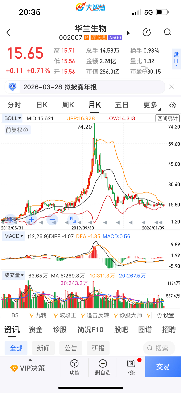 $华兰生物(SZ002007)$ 就问这种月线级别的BOLL线,大家为什么不去想翻倍,管他业绩,技术面月线级别走成这样怕啥?