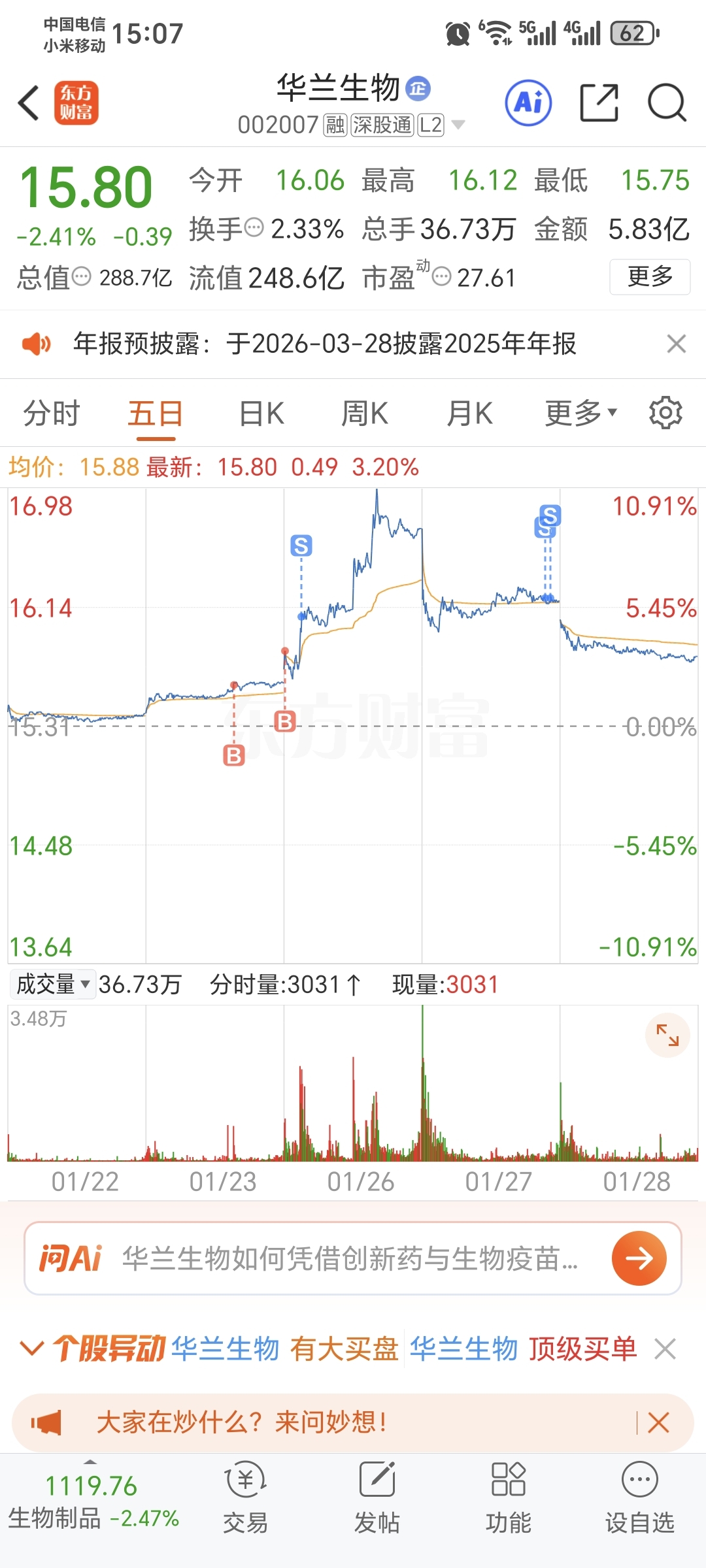 $华兰生物(SZ002007)$ 拿了两个半月,昨天挣点利息清仓了。该换其他兄弟来站岗了!