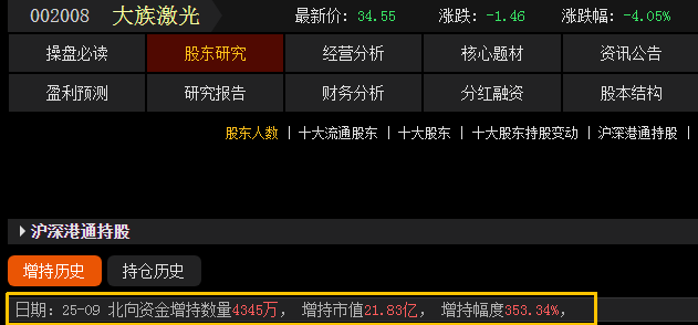 北向数据看了没,看了没?大族激光三季度北向资金增持数量4345万,增持市值21.