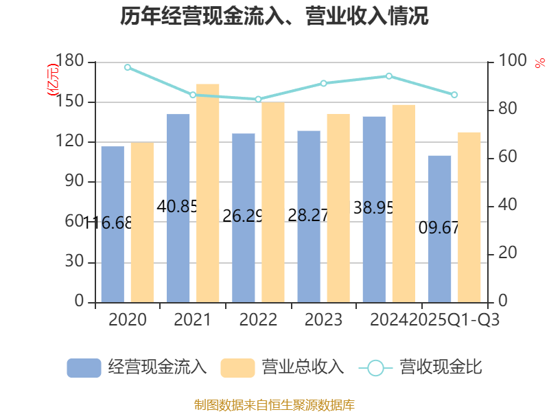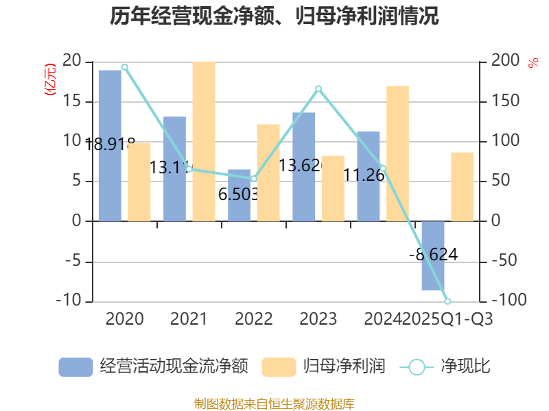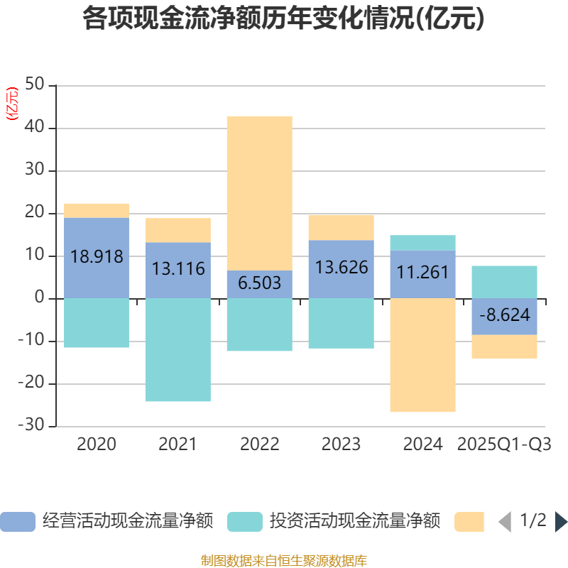 2025年前三季度,公司经营活动现金流净额为-8.62亿元,同比减少9.48亿元;筹资活动现金流净额-5.54亿元,同比增加20.79亿元;投资活动现金流净额7.58亿元,上年同期为-9.29亿元。