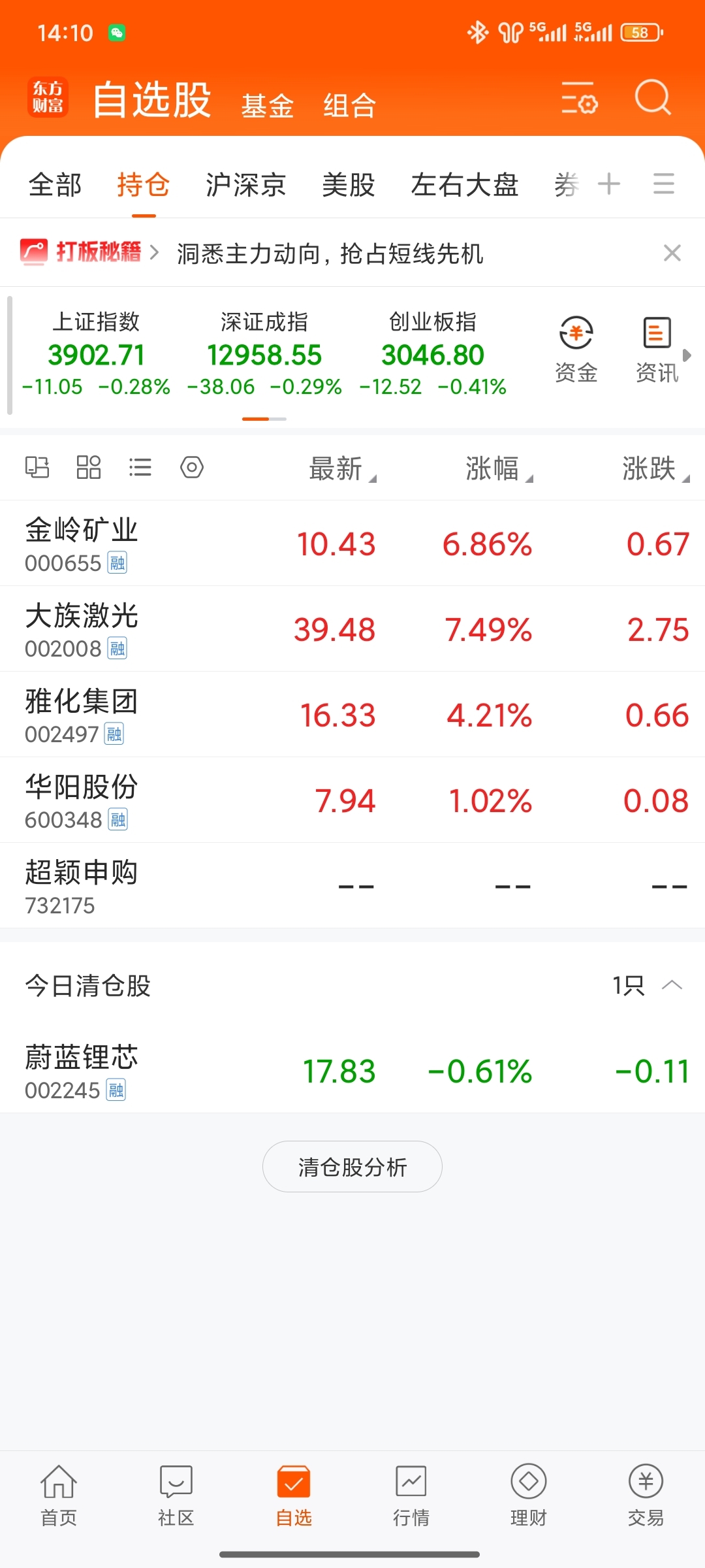 $大族激光(SZ002008)$ $金岭矿业(SZ000655)$ $雅化集团(SZ002497)$ 此行情六只持仓票四红一绿一平盘,继续跟着感觉走,低头走自己的路,不要被路程中的噪声乱了心境。今日知识点:永远不要满仓单吊一只票,哪怕你再看好,请最多以60%仓位应对,过来人的经验,满仓即是你大回撤、大亏损的开始