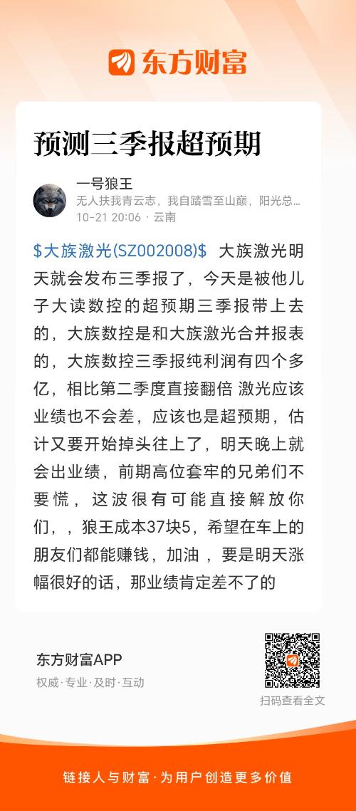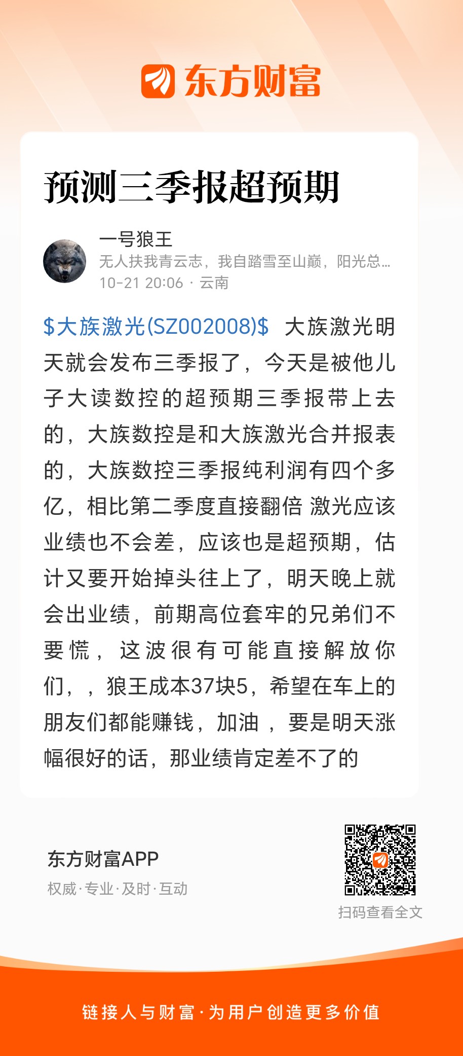 $大族激光(SZ002008)$ 大族激光明天就会发布三季报了,今天是被他儿子大读数控的超预期三季报带上去的,大族数控是和大族激光合并报表的,大族数控三季报纯利润有四个多亿,相比第二季度直接翻倍 激光应该业绩也不会差,应该也是超预期,估计又要开始掉头往上了,明天晚上就会出业绩,前期高位套牢的兄弟们不要慌,这波很有可能直接解放你们,,狼王成本37块5,希望在车上的朋友们都能赚钱,加油 ,要是明天涨幅很好的话,那业绩肯定差不了的