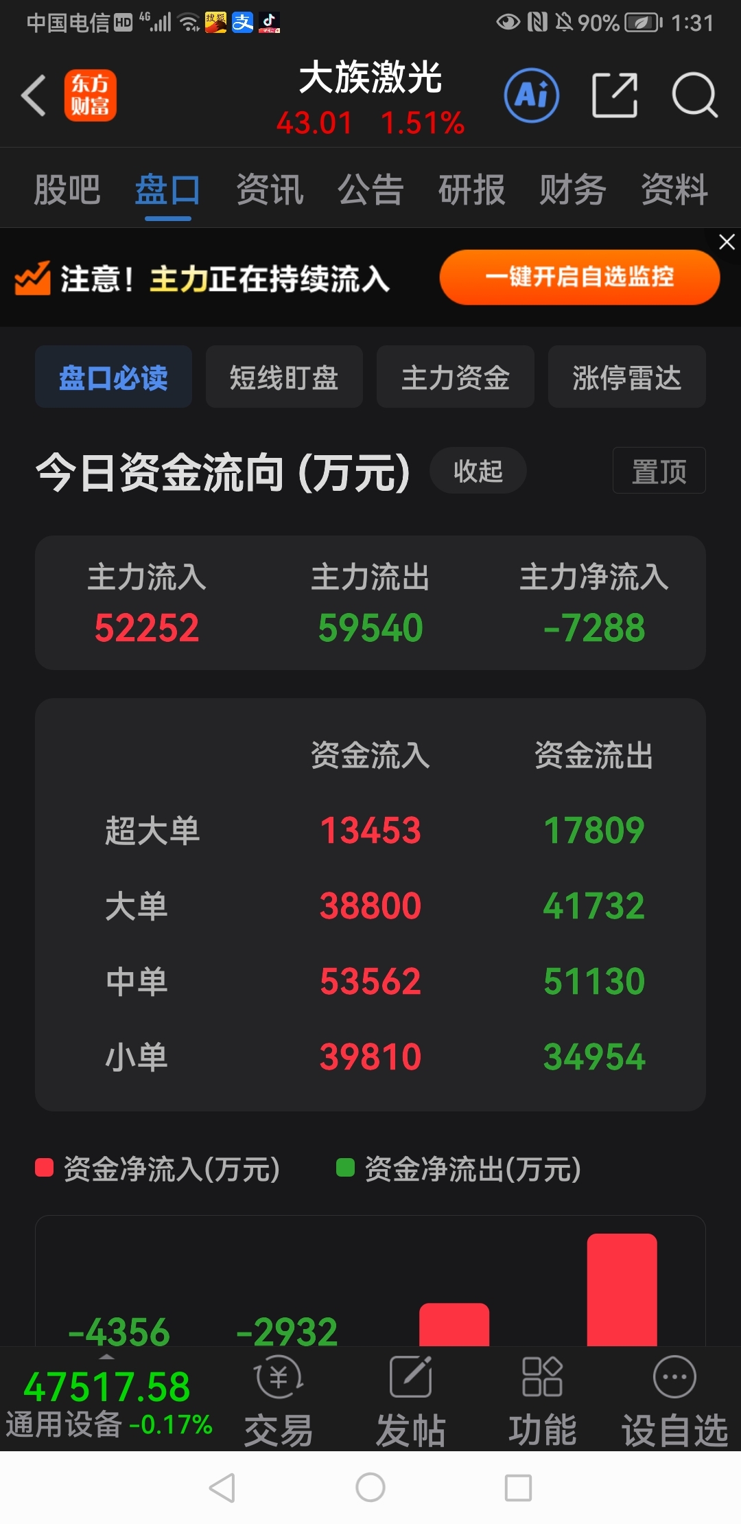 $大族激光(SZ002008)$ 大盘中级调整在即,先知先觉的主力资金上午已源源不断派发获利筹码。