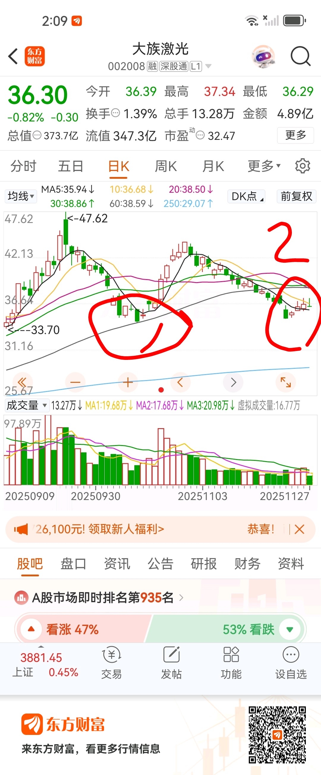 $大族激光(SZ002008)$ 2处的反弹涨幅和量,明显远不如1处。所以,这一波必然会继续往下砸,直到砸出量能,才会企稳。不放量,就不会企稳。当然,别指望主力放量砸。要的是散户卖出的量。