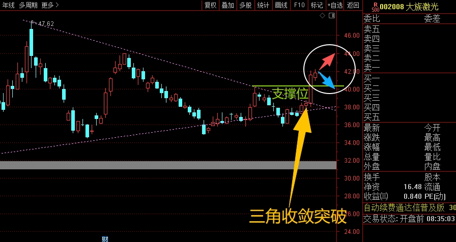 $大族激光(SZ002008)$ 这两天完成了大的三角收敛动作后的方向突破,非常漂亮,接下来就看能不能继续横盘或者是继续震荡上行吧,回调的话就看脚底绿色横线的支撑位即可,只要不跌破,问题都不大,有效跌破就控制仓位应对即可。#复盘记录# #炒股日记#