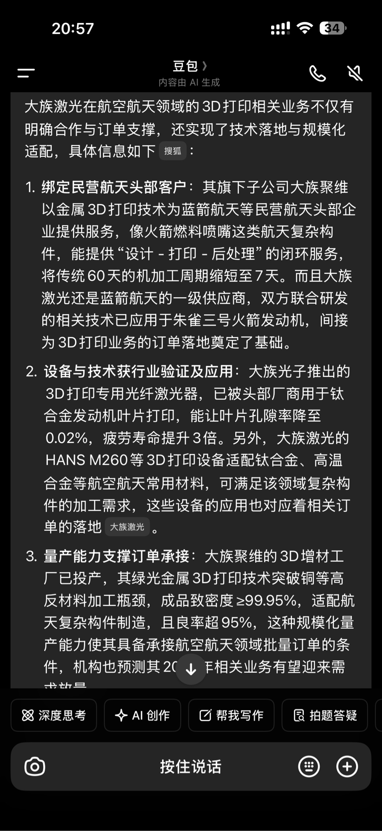 $大族激光(SZ002008)$ 大族激光在航空航天领域的3D打印相关业务,不仅有明确合作与订单支撑,还实现在技术落地与规模化适配