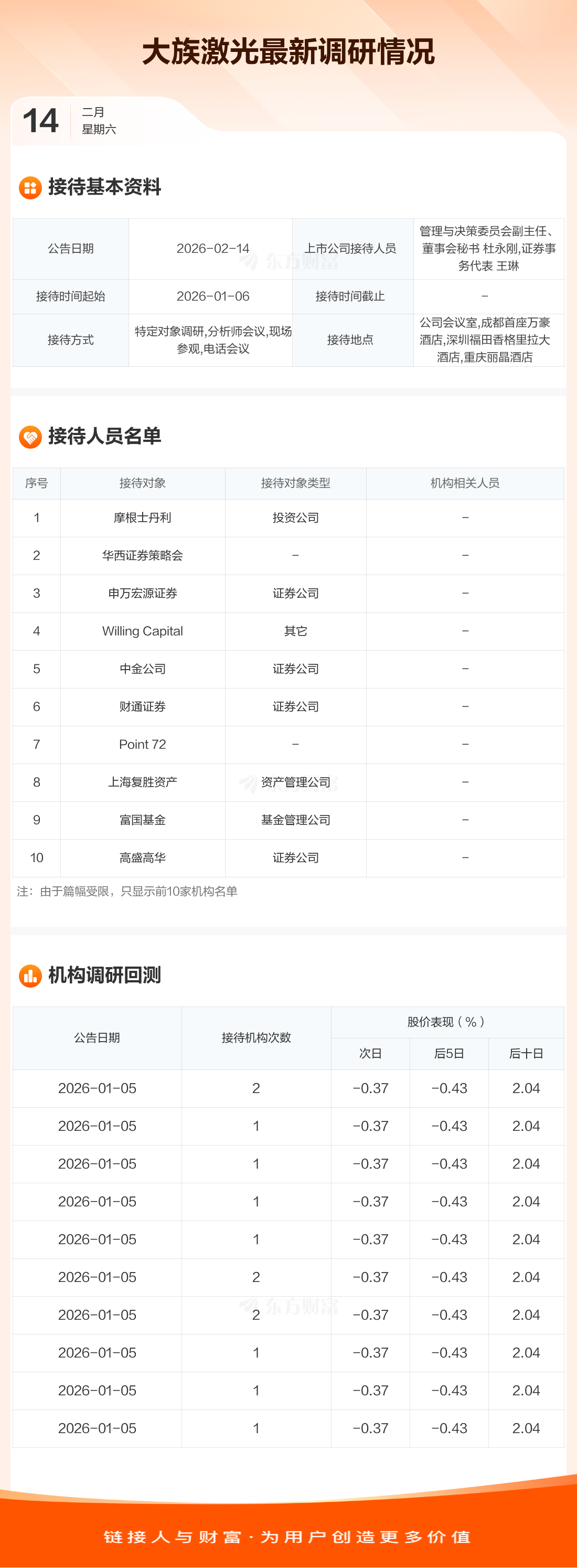 大族激光2月14日公告称,1月6日接待摩根士丹利等33家机构调研。接待人员包括管理与决策委员会副主任、董事会秘书 杜永刚,证券事务代表 王琳。