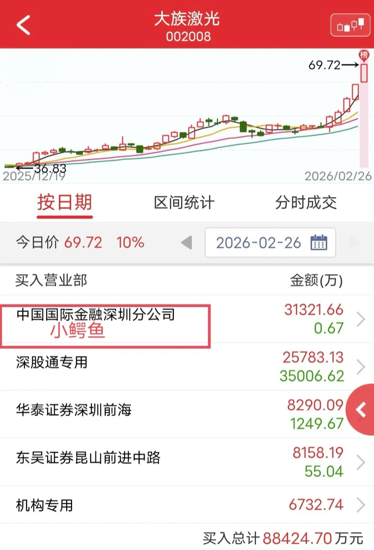 小鳄鱼爆买3个亿:今天大族激光盘中涨停。盘后龙虎榜显示,小鳄鱼三个交易日爆买3个